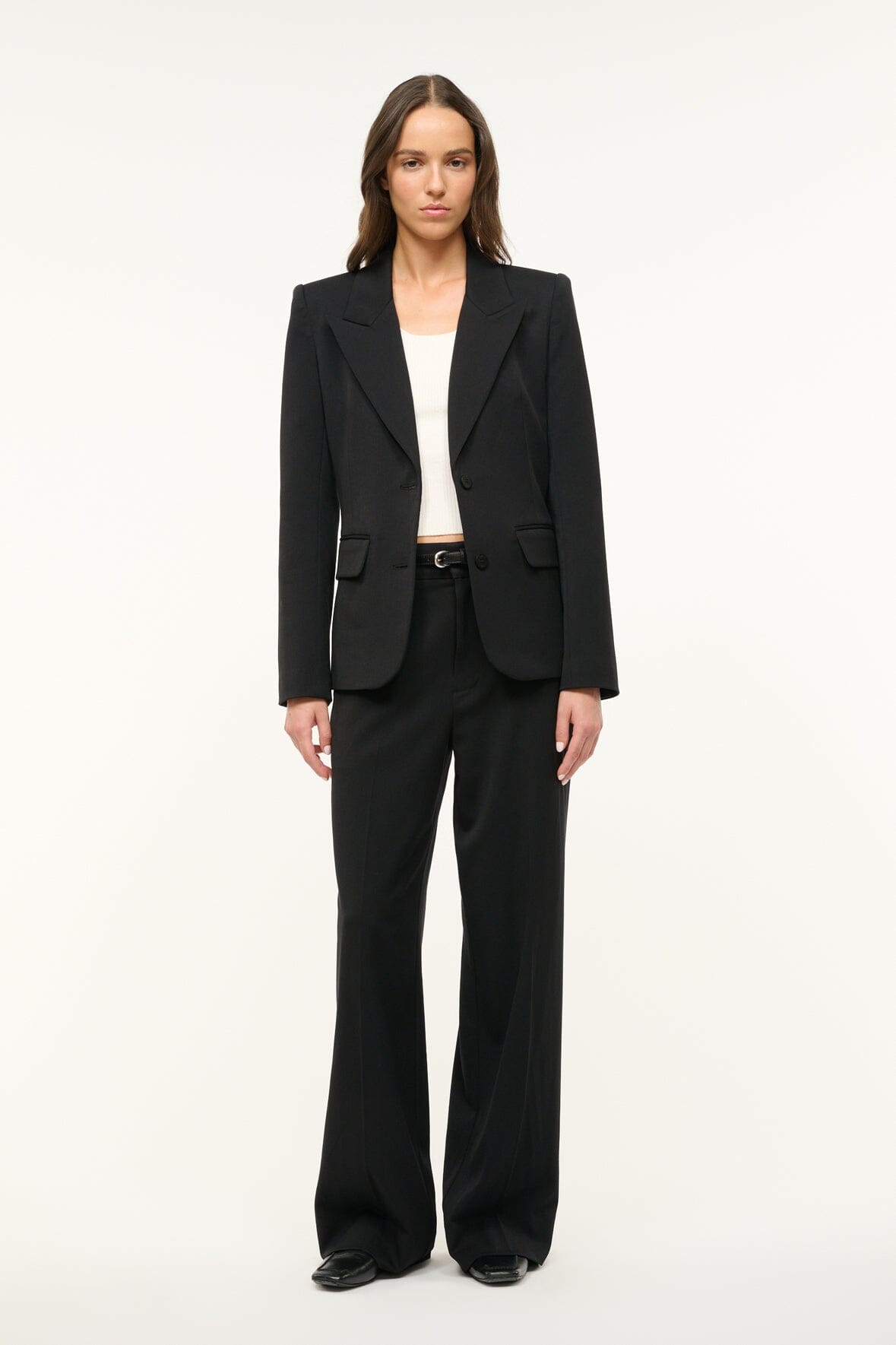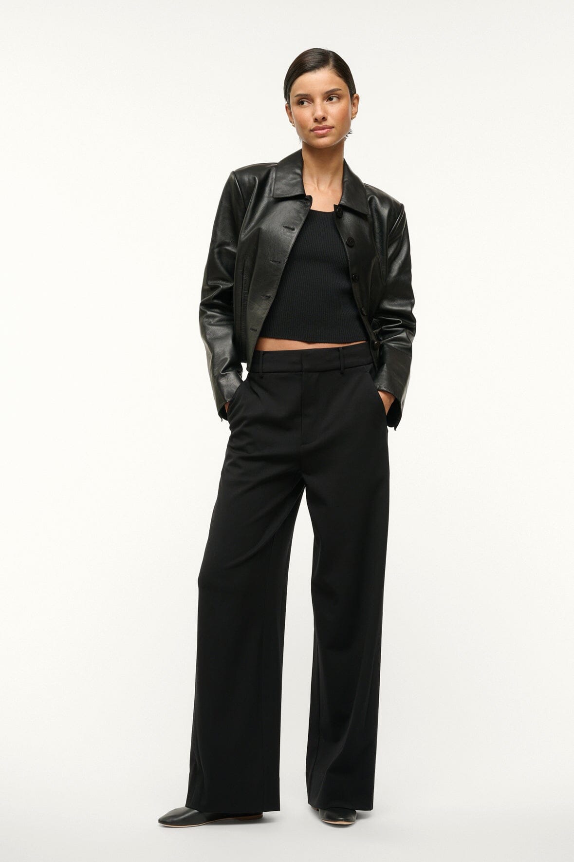 The Prince Pant is a flat front wide leg pant made from soft suiting. It features a zipper fly and back welt pockets.