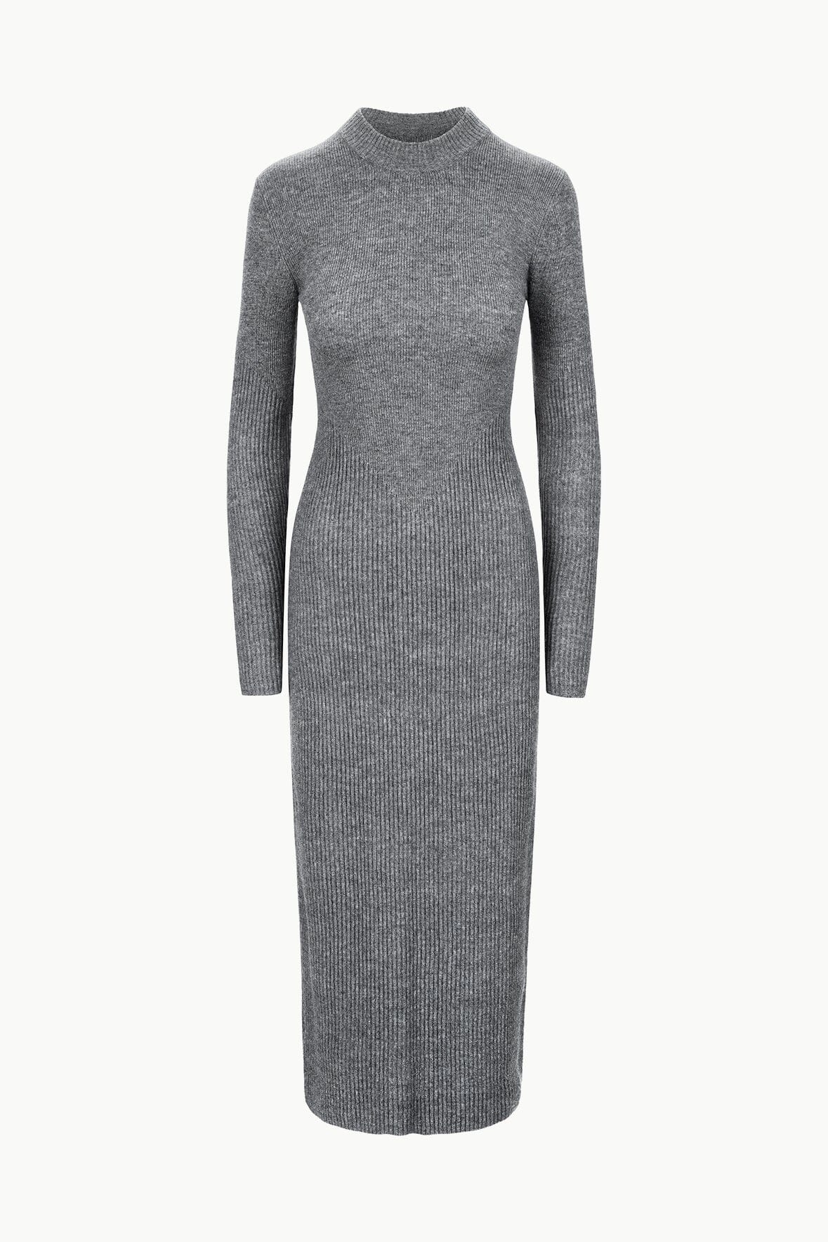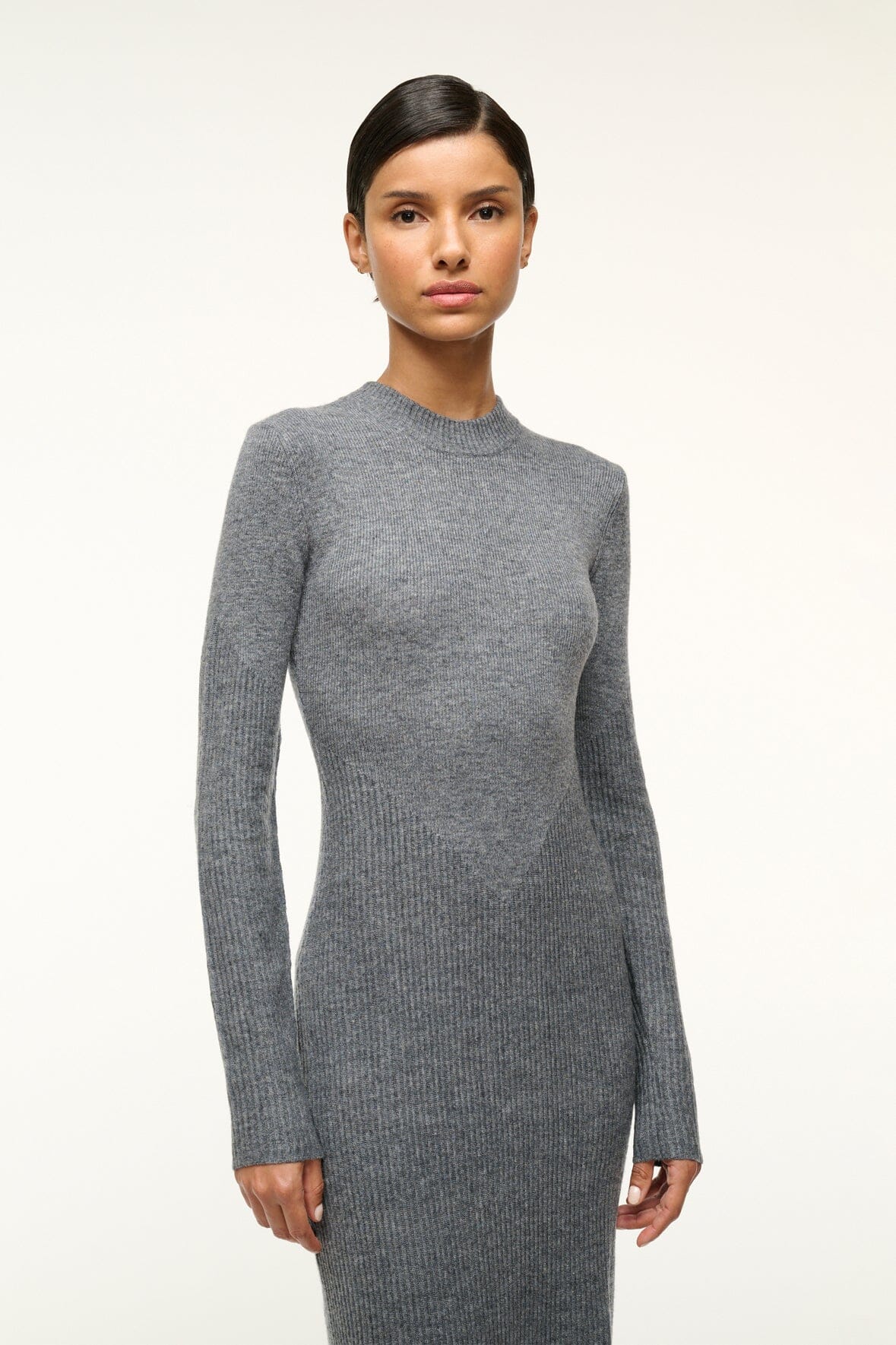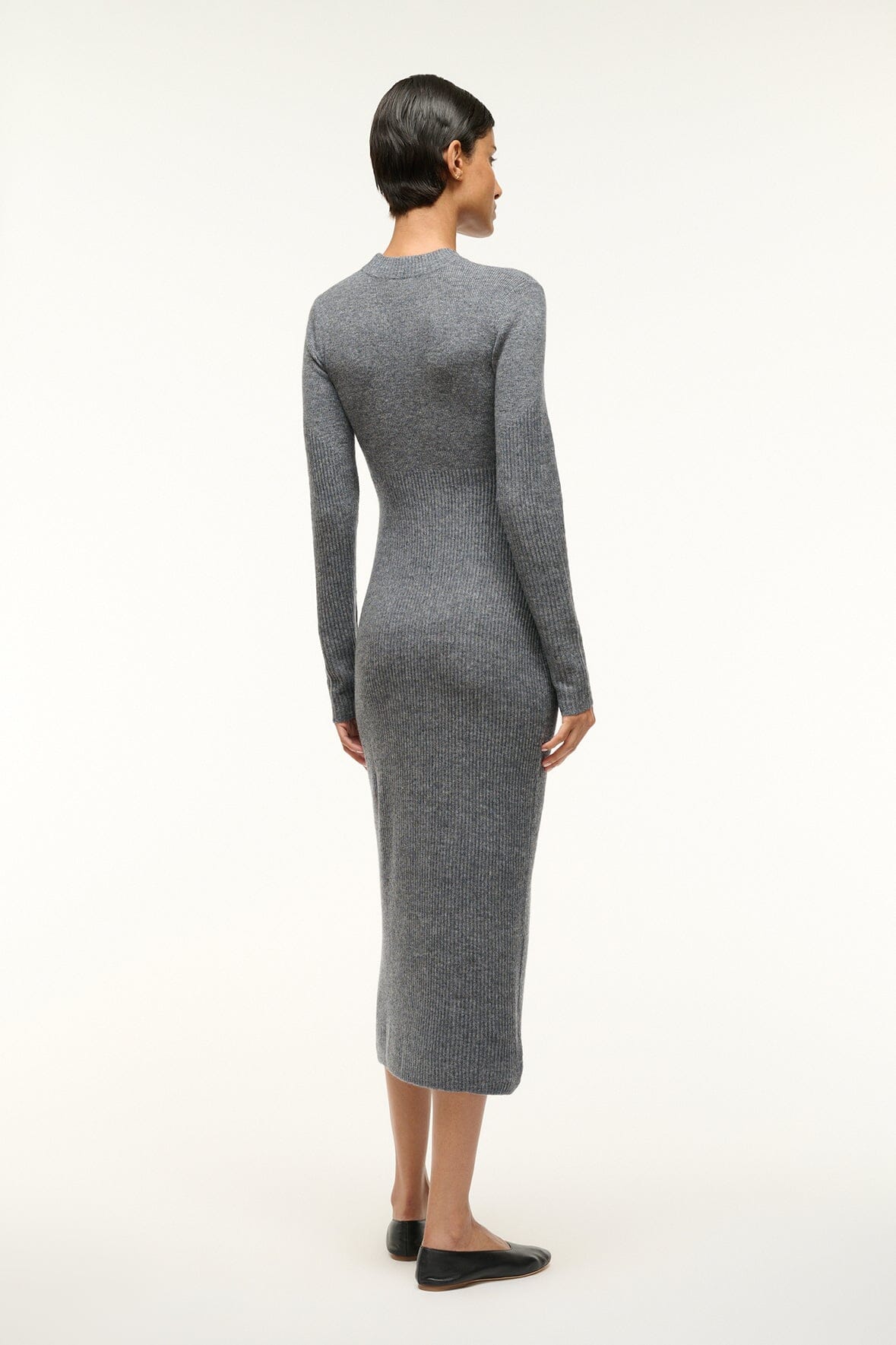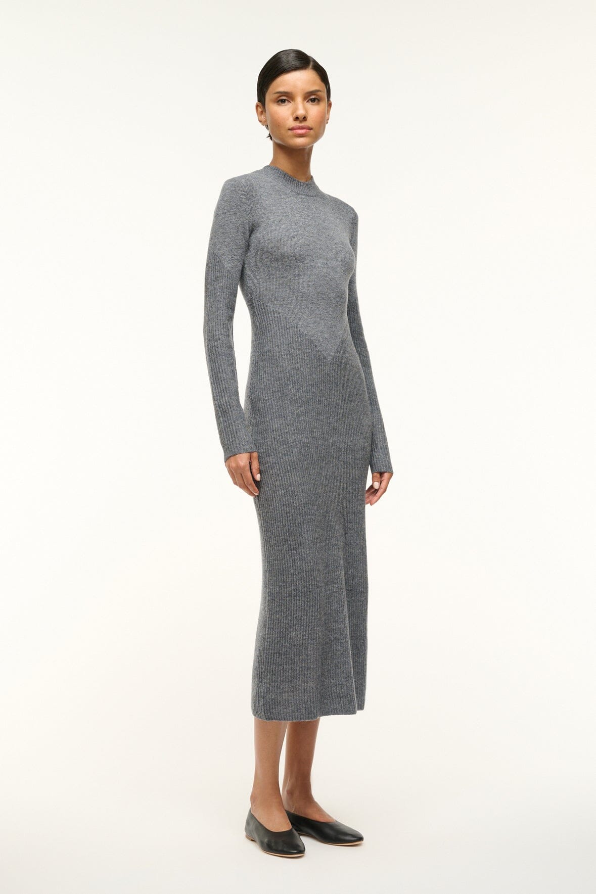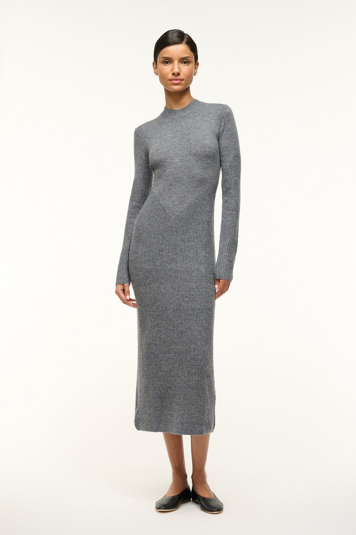 The Ramona Dress is a long sleeve fitted midi dress in a soft merino knit. This style has a mock neck and has ottoman stitch detailing for a flattering fit.