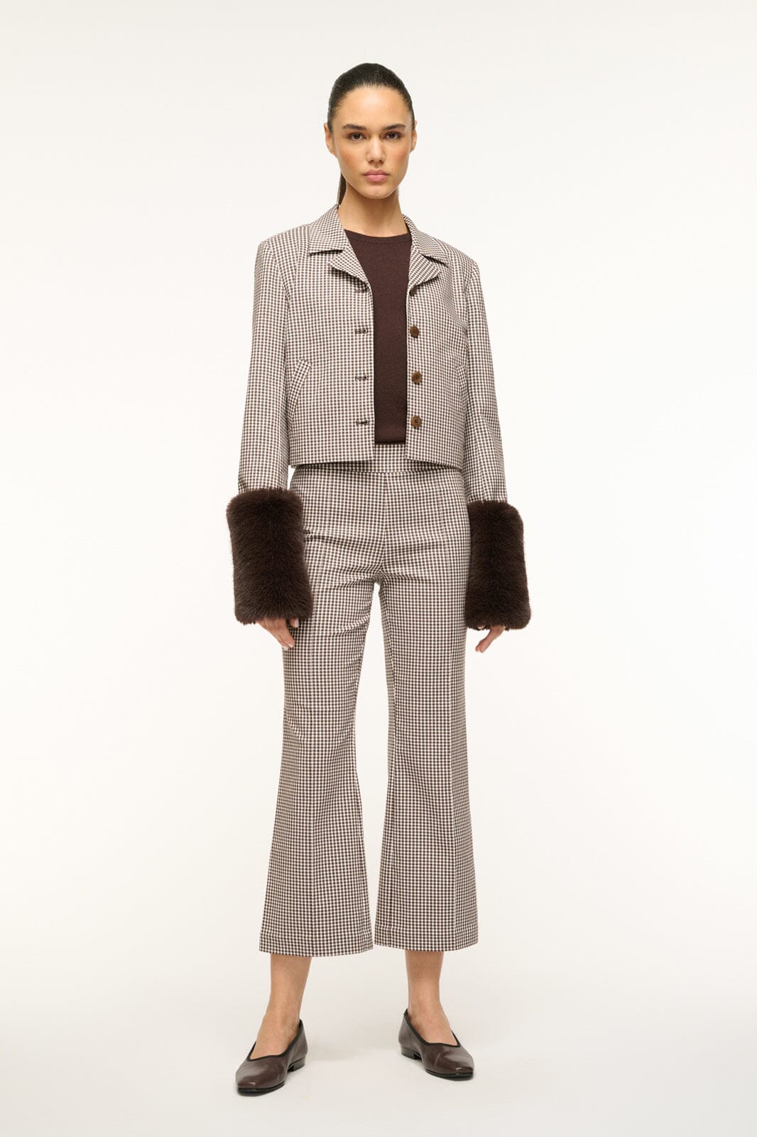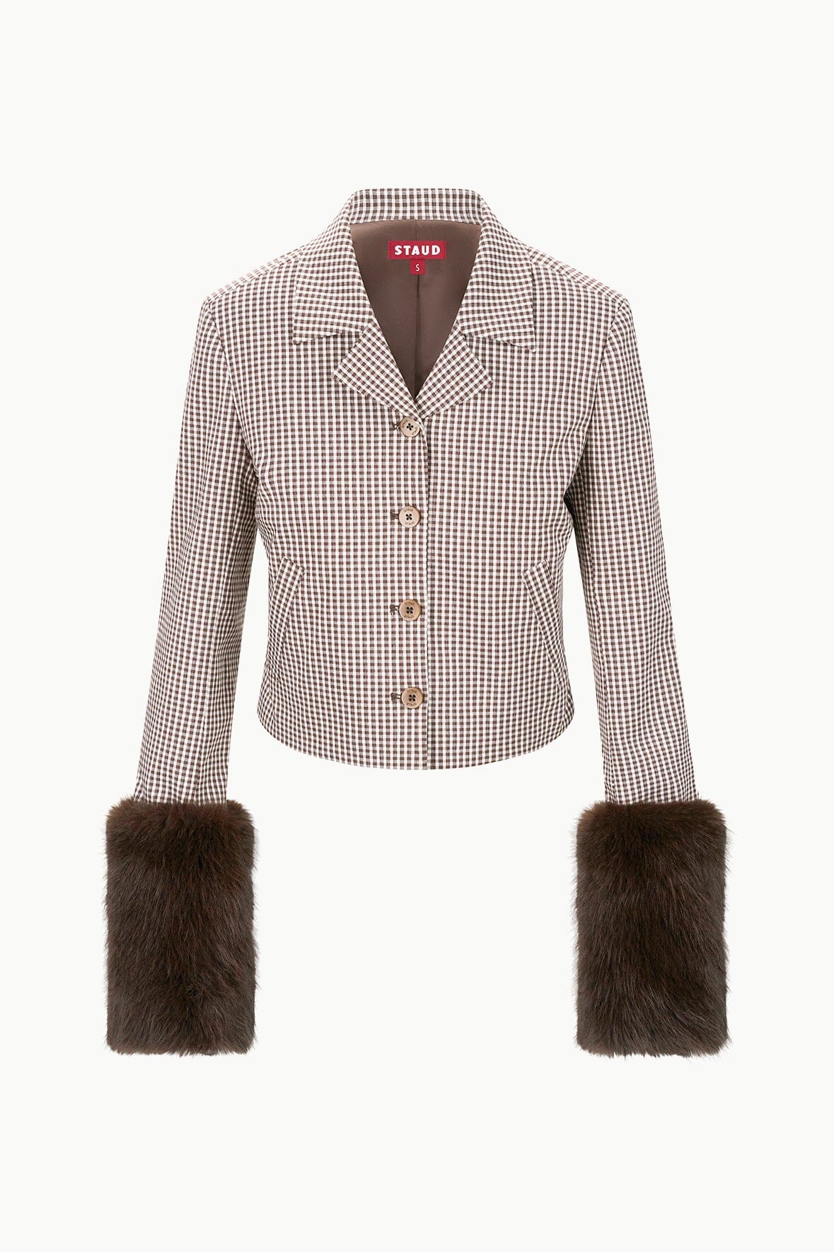 The Regency Jacket is a cropped button front jacket with notched lapels. It features removable faux fur cuffs and pairs back to the Knack Pant for a matching set.