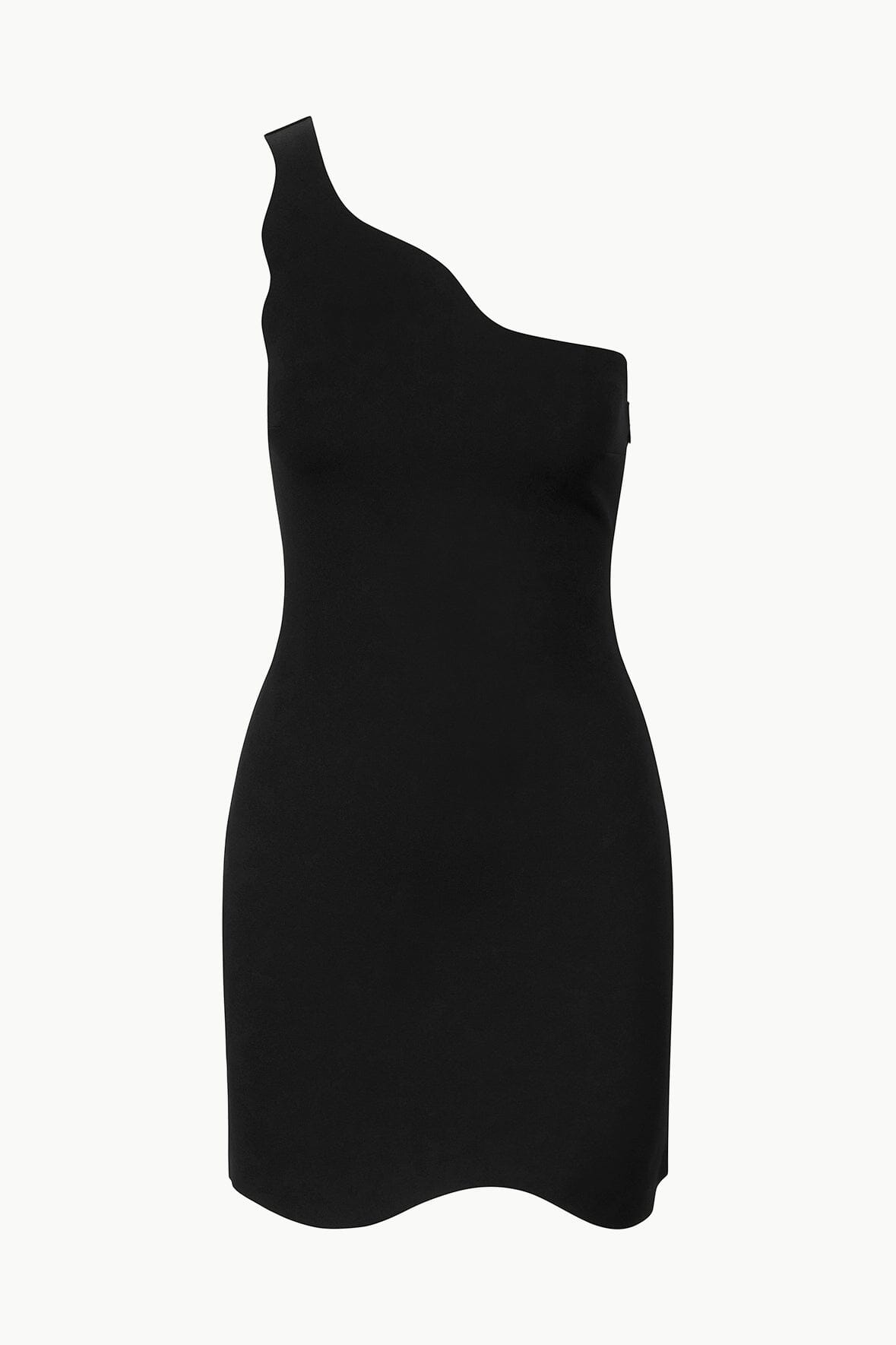 The Riviera is a one shoulder fitted mini dress with an asymmetrical wave neckline and hem.