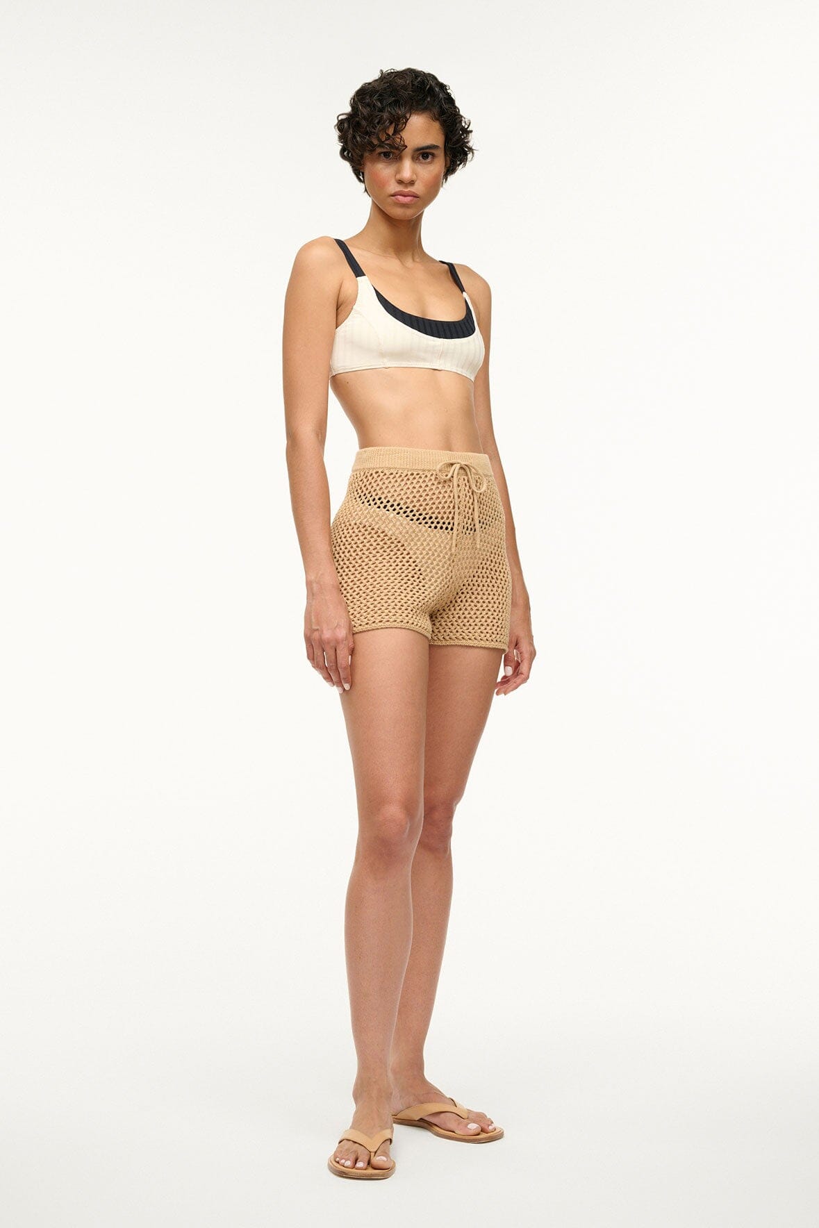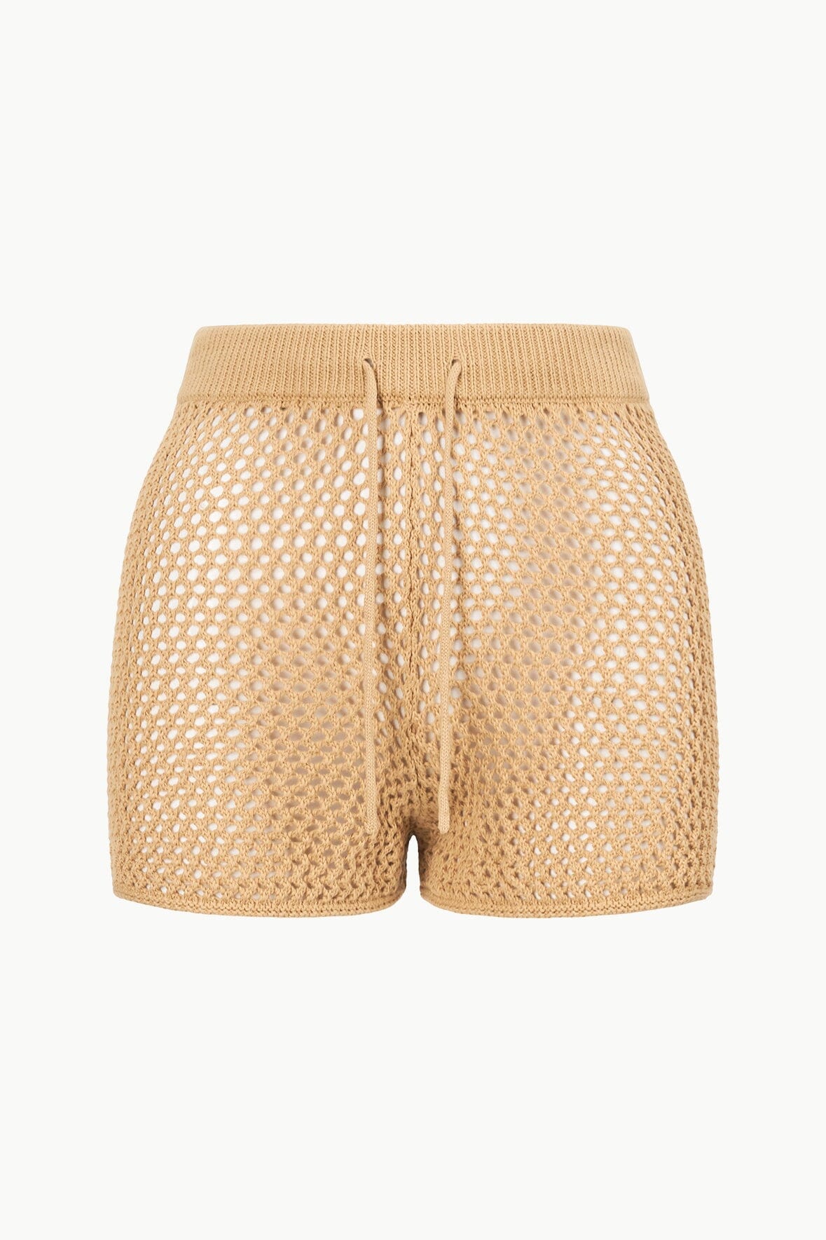 The Savoca Coverup Short are a high rise pull-on short with a center front drawstring. They are made from a mesh pointelle stitch fabric and pair back to our Sovana and Corricella coverup tops.