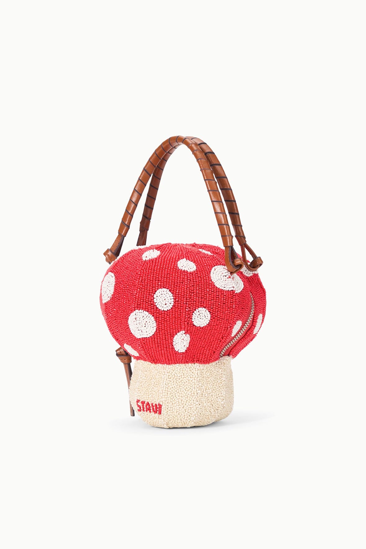 A hand-beaded handheld bag with detachable crossbody strap, the Shroom features a leather-wrapped handle and zipper opening.