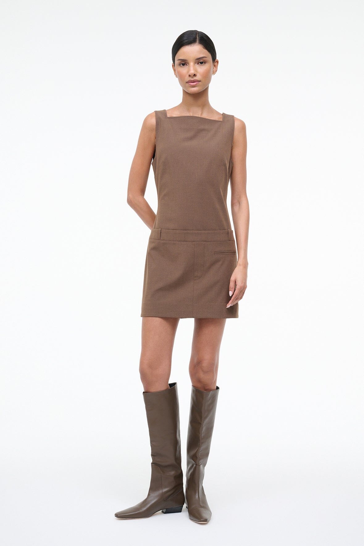 The Skyla mini shift dress features a classic boat neckline and flattering drop waist with integrated belt loops. Crafted from stretch suiting, this versatile piece moves with you while maintaining its polished silhouette.