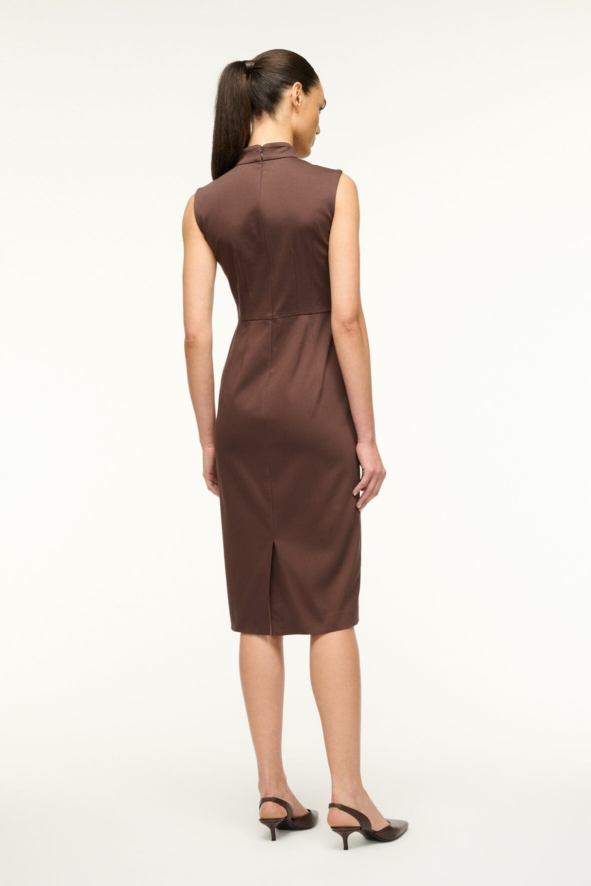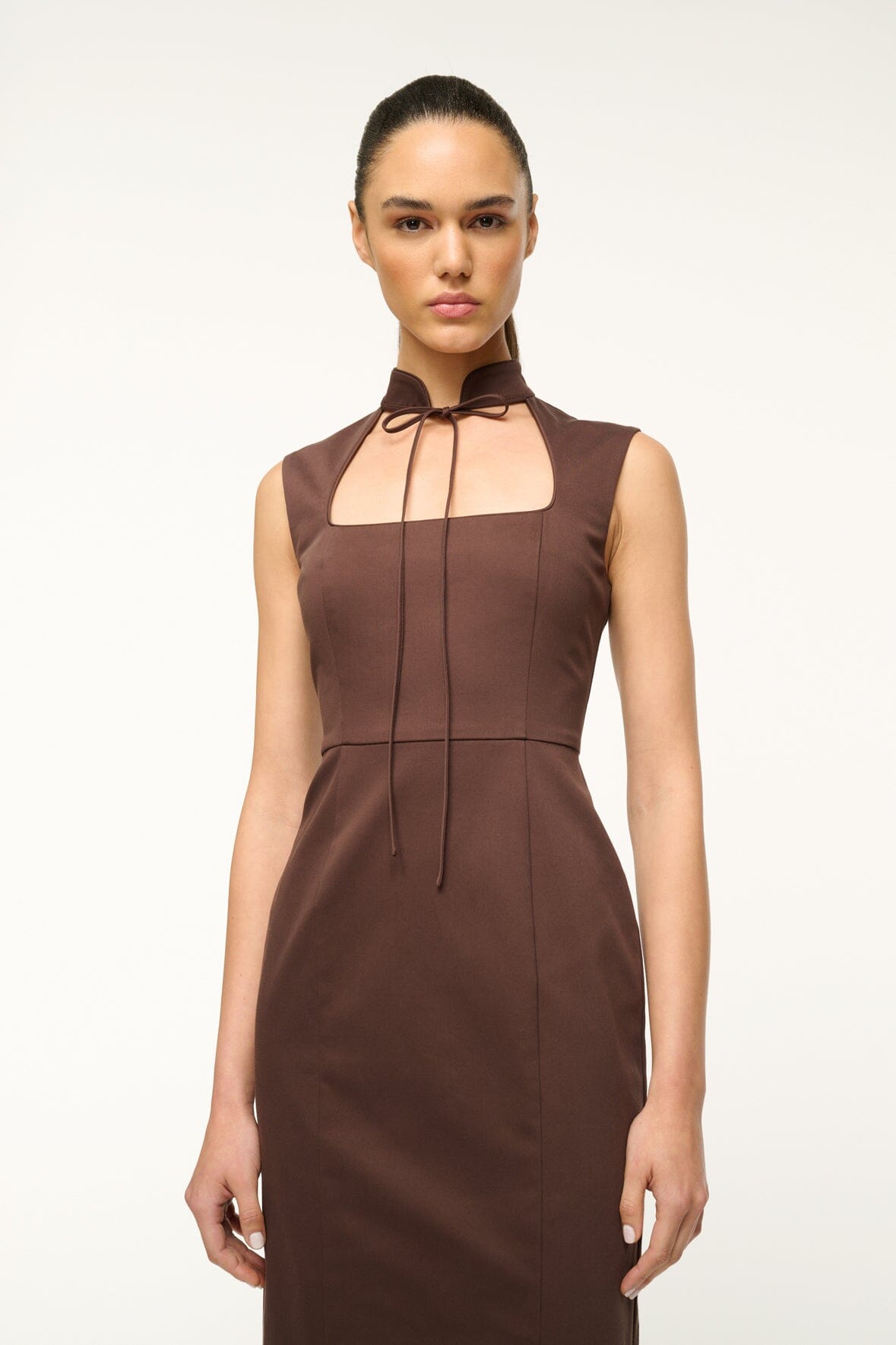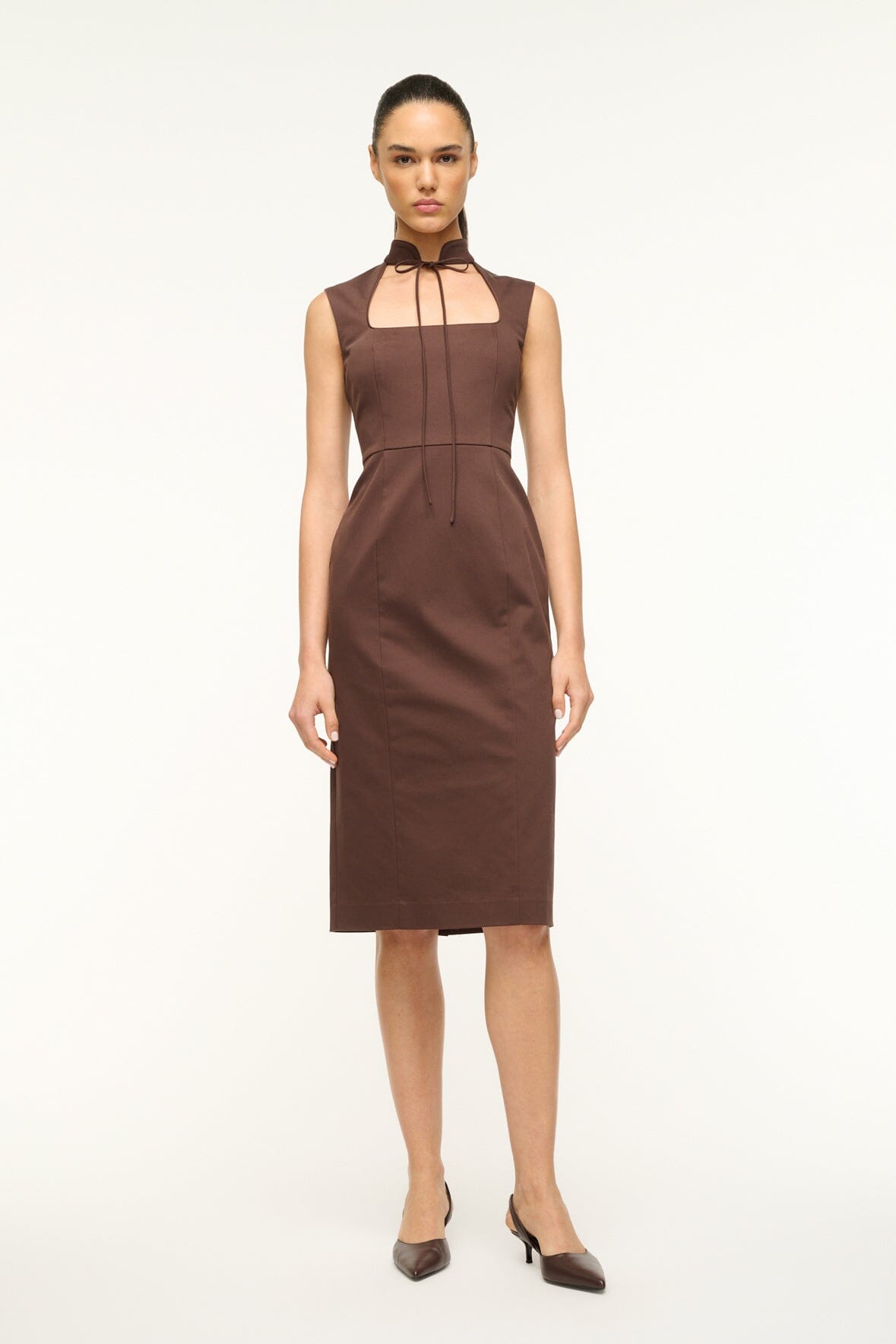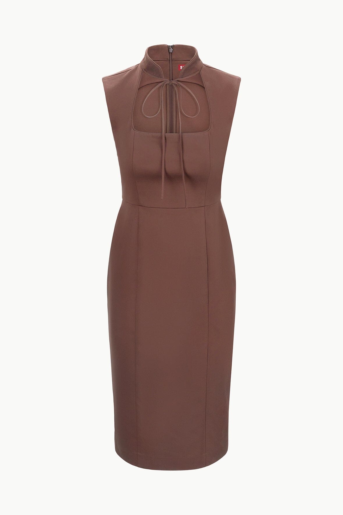 The Mariano Dress is a bustier inspired dress with cut out neckline, mandarin collar, and self ties. This is a slim fitting dress with a center back zipper and slit.