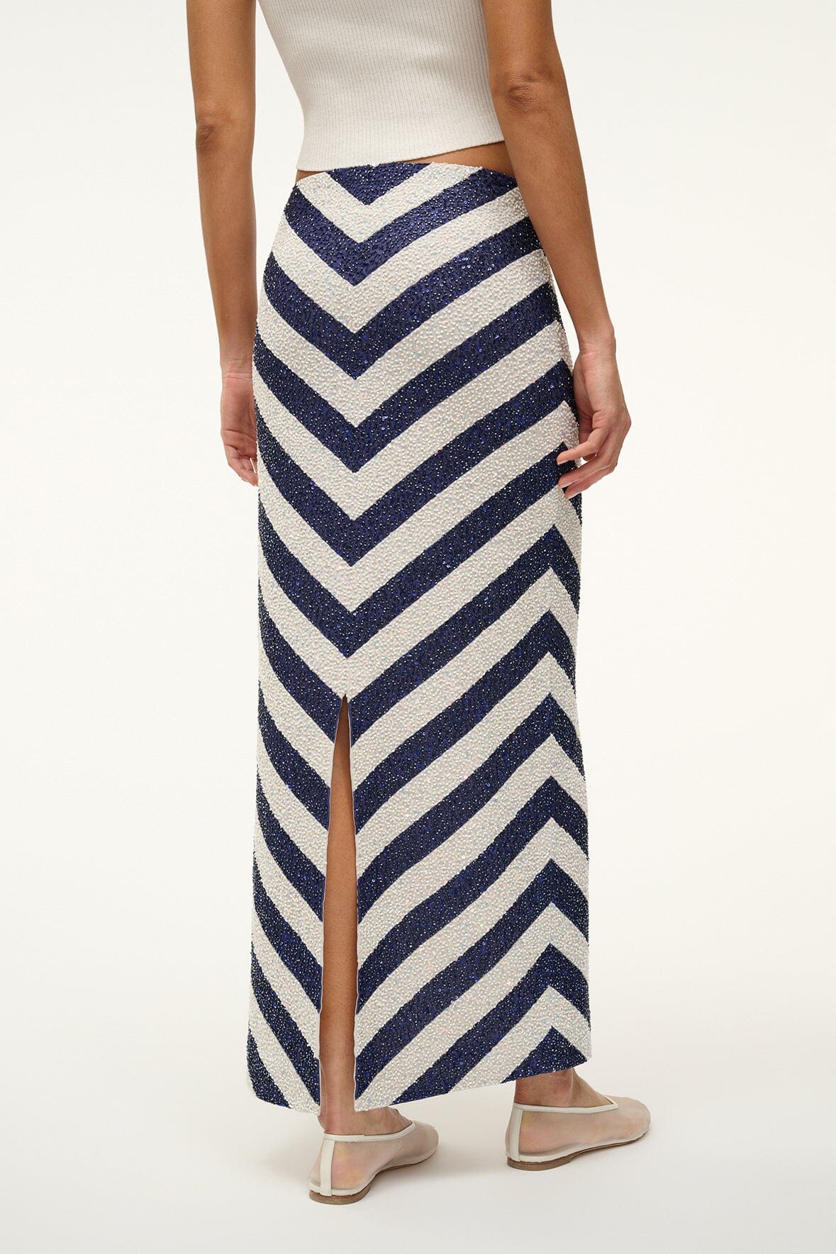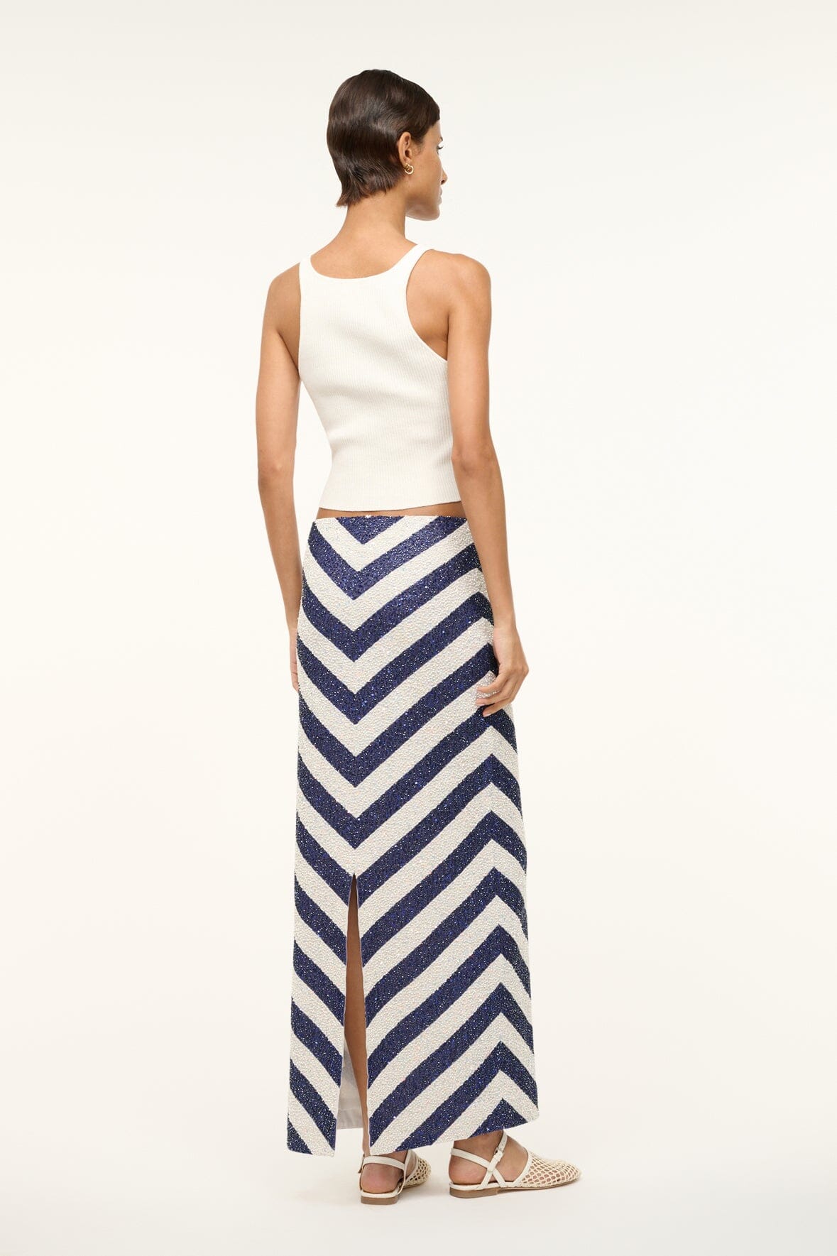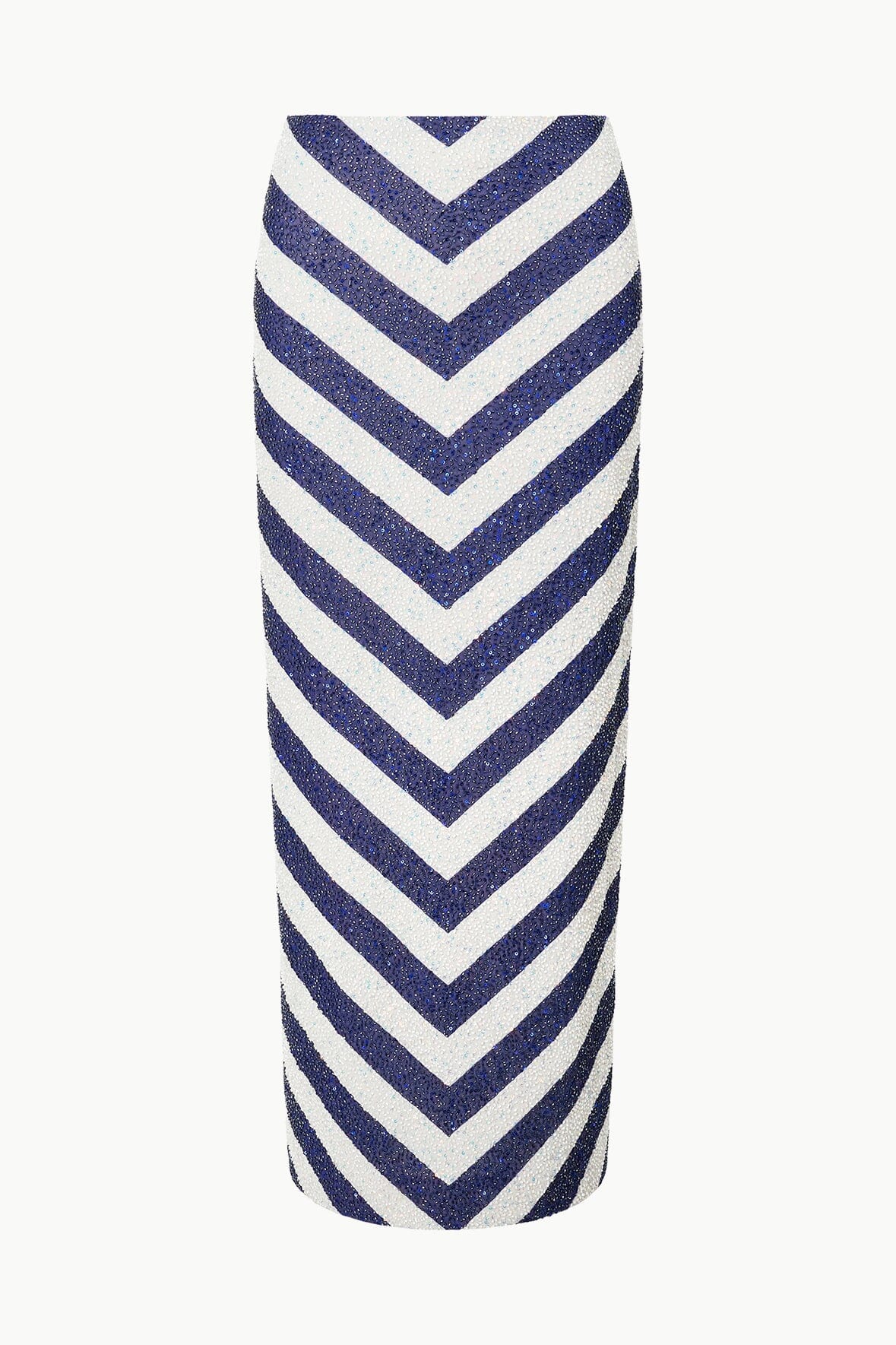 A fully beaded ankle-length skirt cut on the bias. The St Tropez Skirt features a wide chevron stripe pattern with navy and white stripes which allow for ease of dressing up or down.