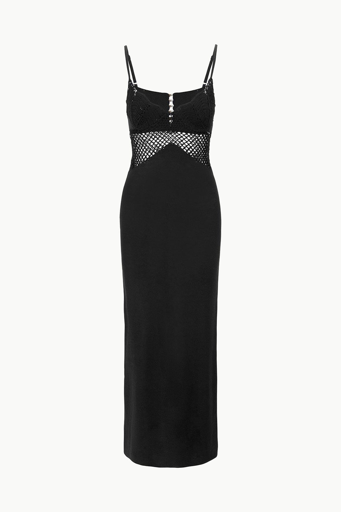The Tara Dress is a sleek, crochet maxi dress with spaghetti straps and sheer crochet panels. The dress features a fitted bodice and skirt, with shell cup detailing at the bust.