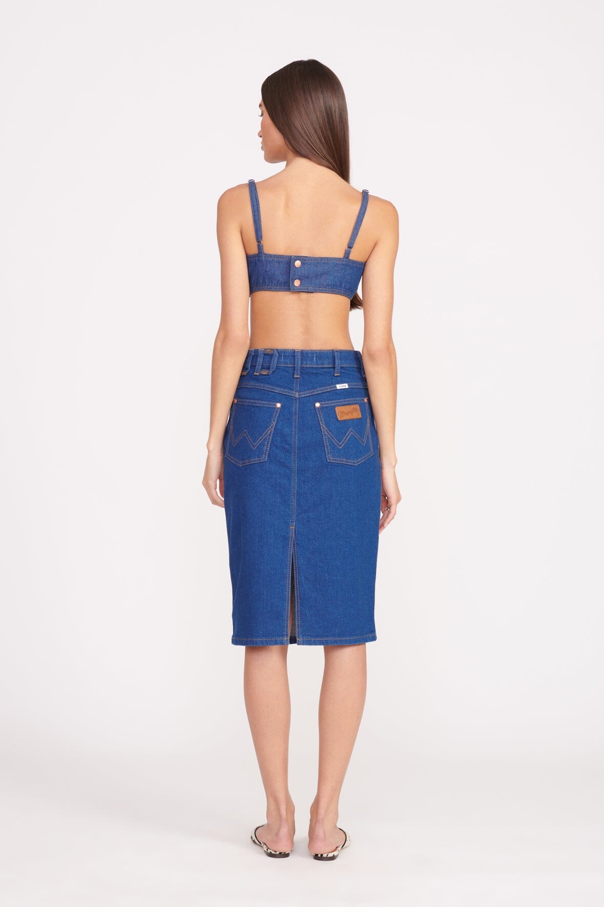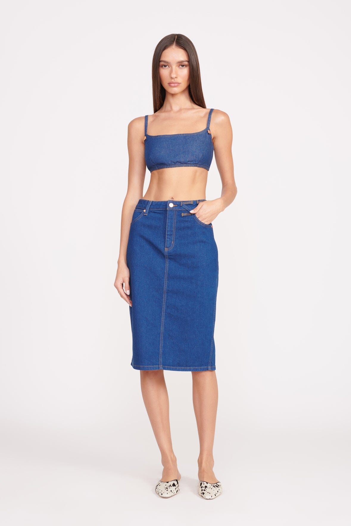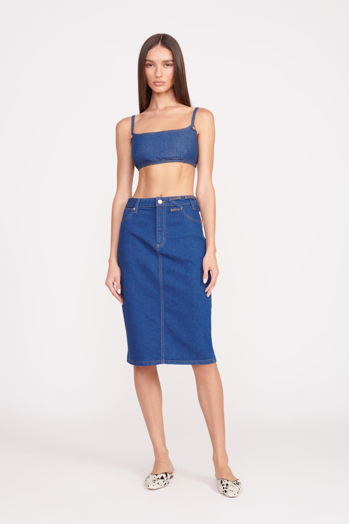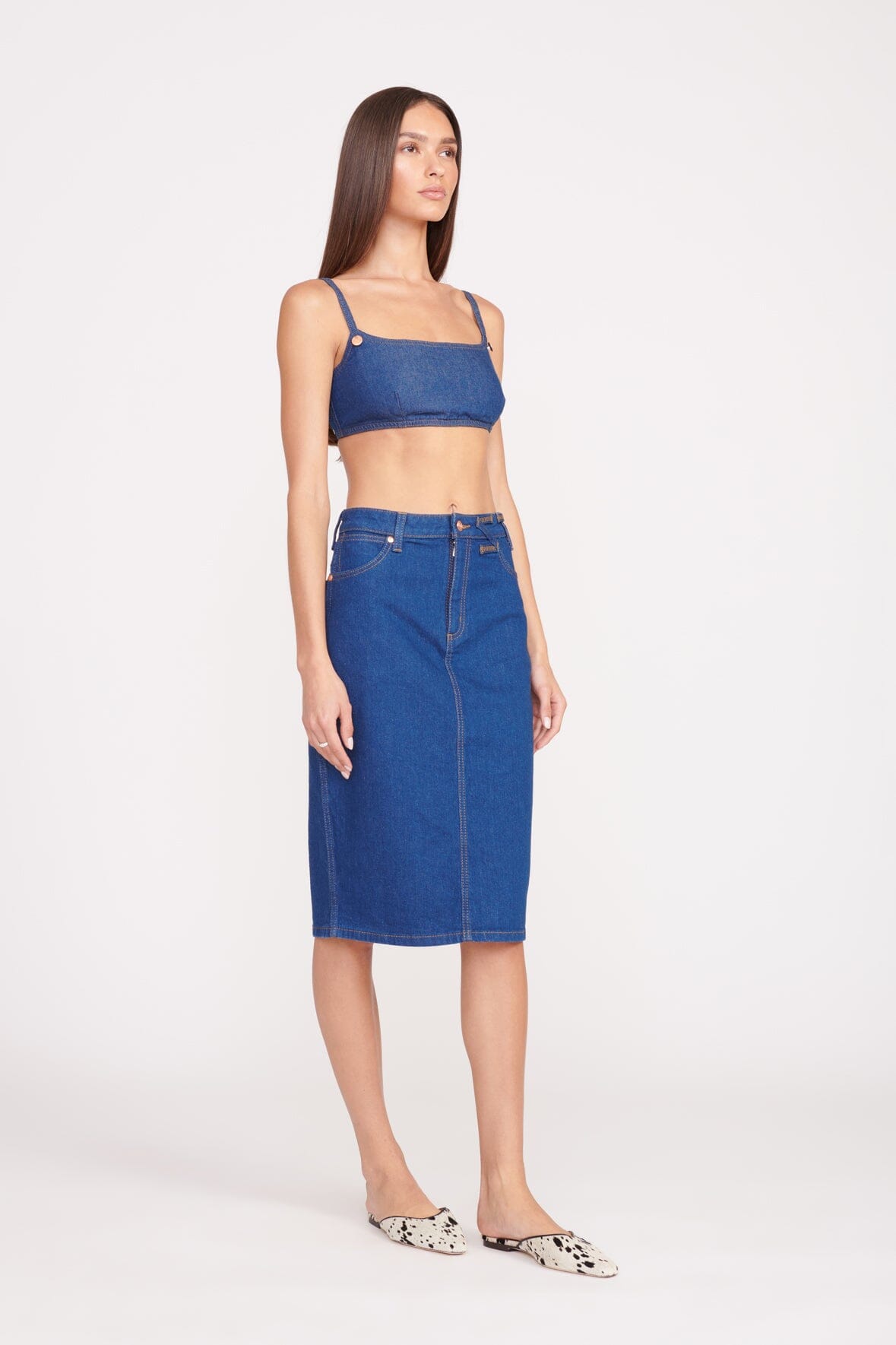 The Pencil Skirt is our perfectly sexy jean skirt. The midrise sits just below the natural waist and has a button and zip fly closure. This style features our STAUD belt loop detail at the waist and a back slit.