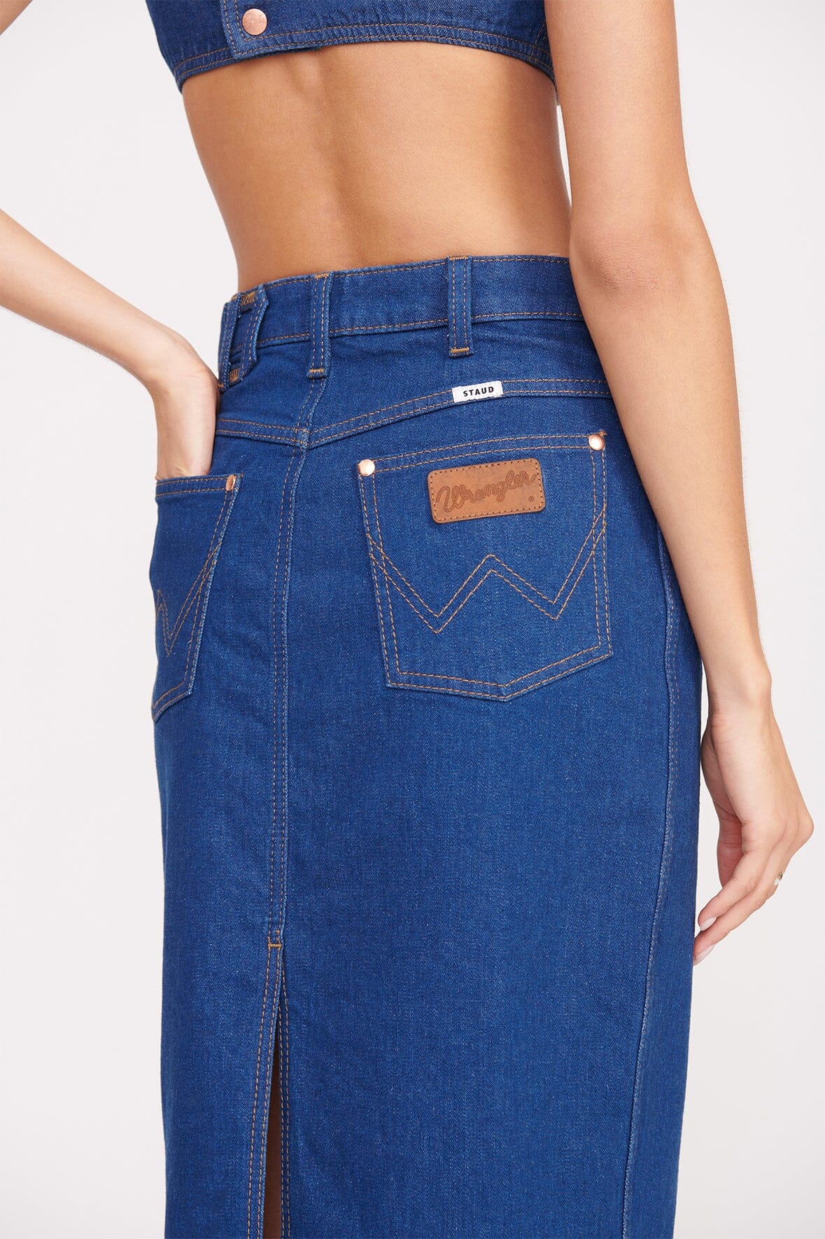 STAUD + WRANGLER THE PENCIL SKIRT DARK RINSE