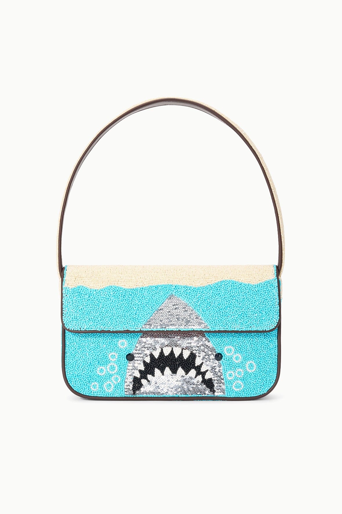 The Tommy Bag is a hand-beaded shoulder bag with vegan leather piping. This style features a single flap closure, inner zip pouch and magnetic pocket on the back.