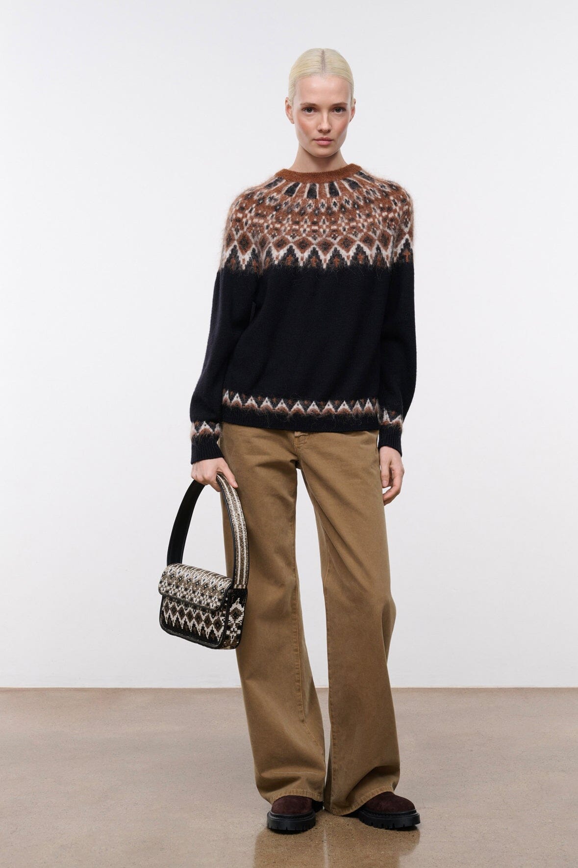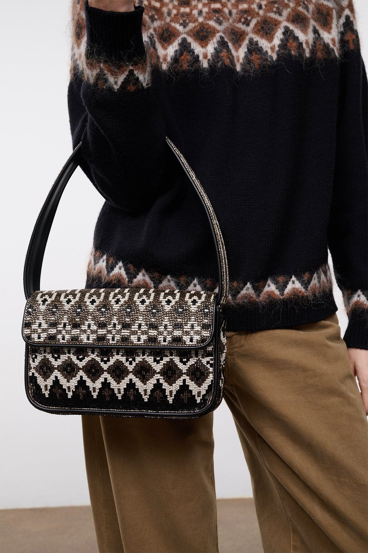 Our latest limited-edition Tommy features a playful seasonal print. The Tommy Bag is a hand-beaded shoulder bag with vegan leather piping. This style features a single flap closure, inner zip, and a back slip pocket.