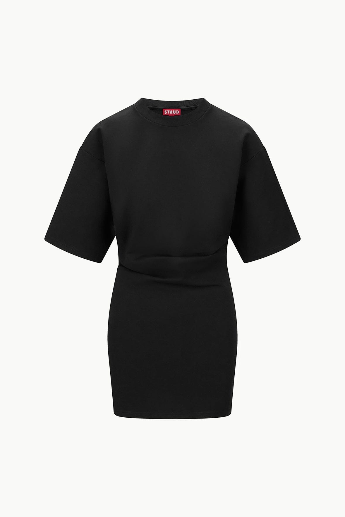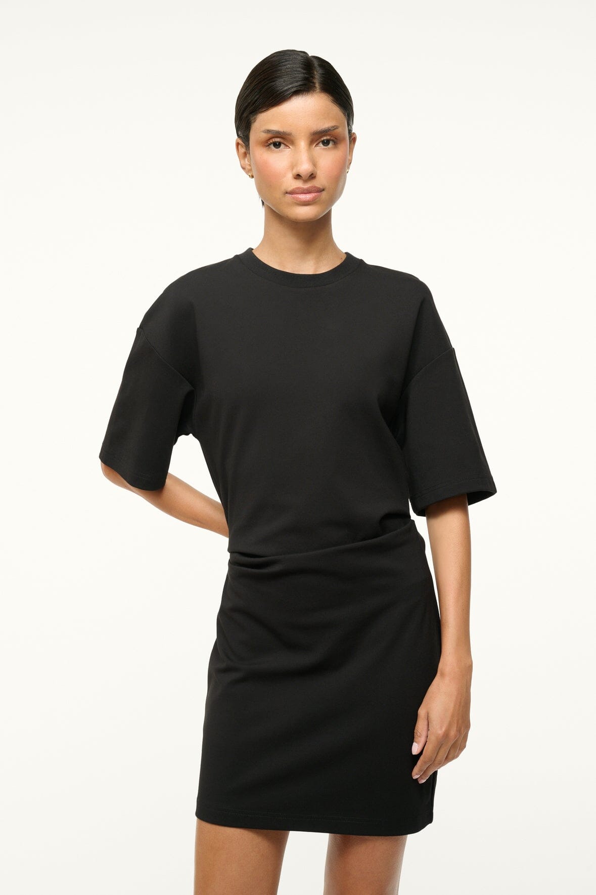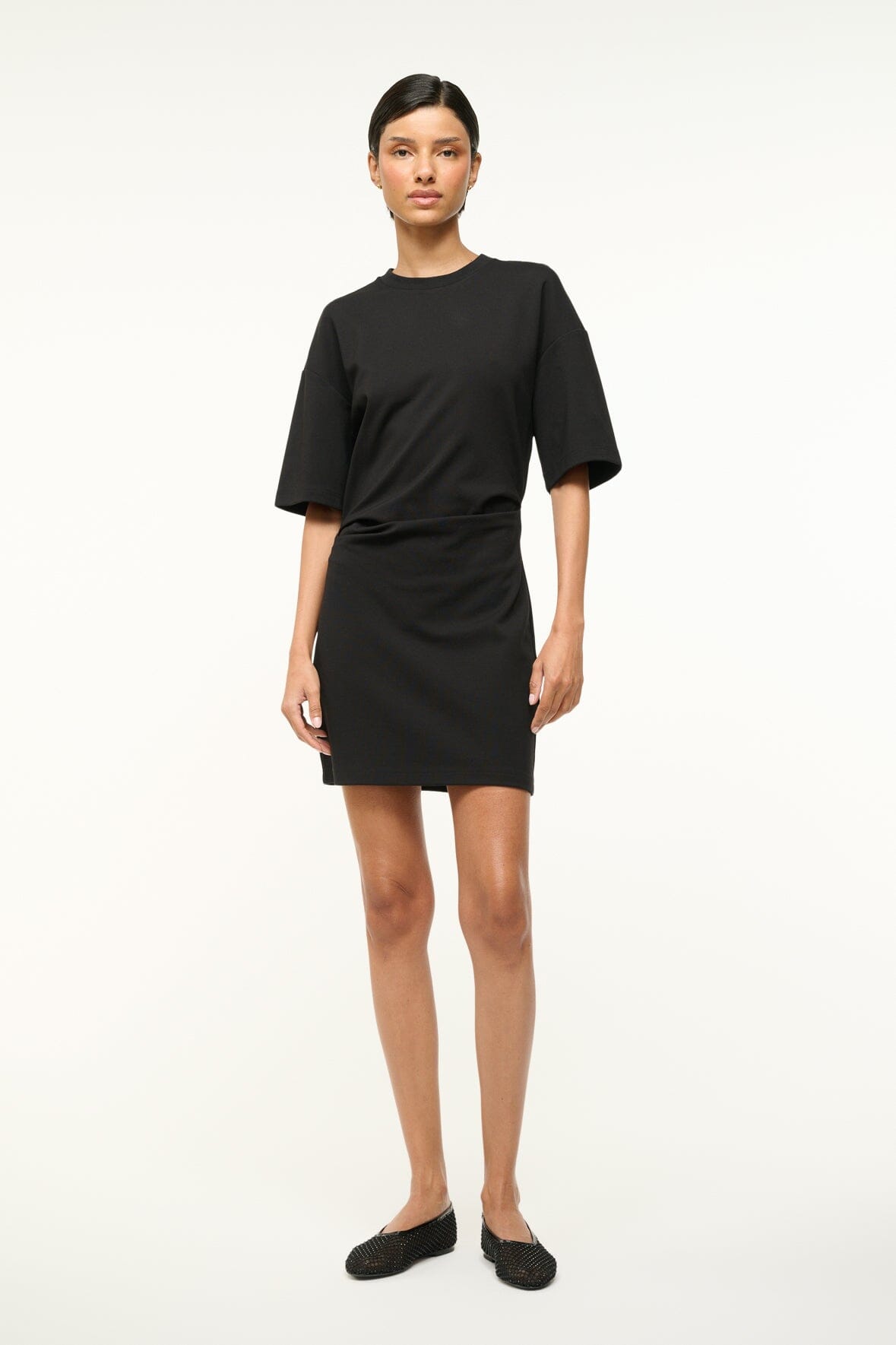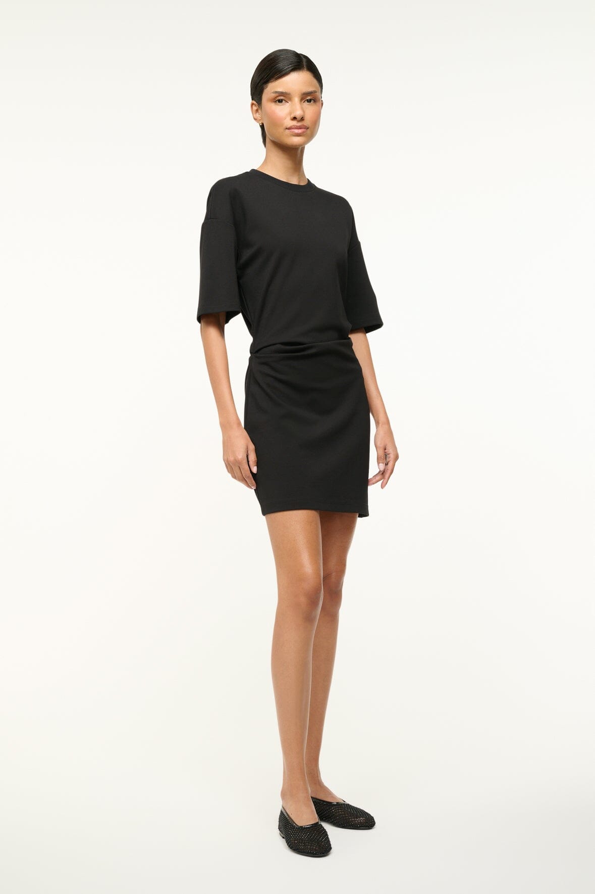 The Truman Mini Dress is a t-shirt inspired dress with wide short sleeves, a gathered waist and a fitted mini skirt.