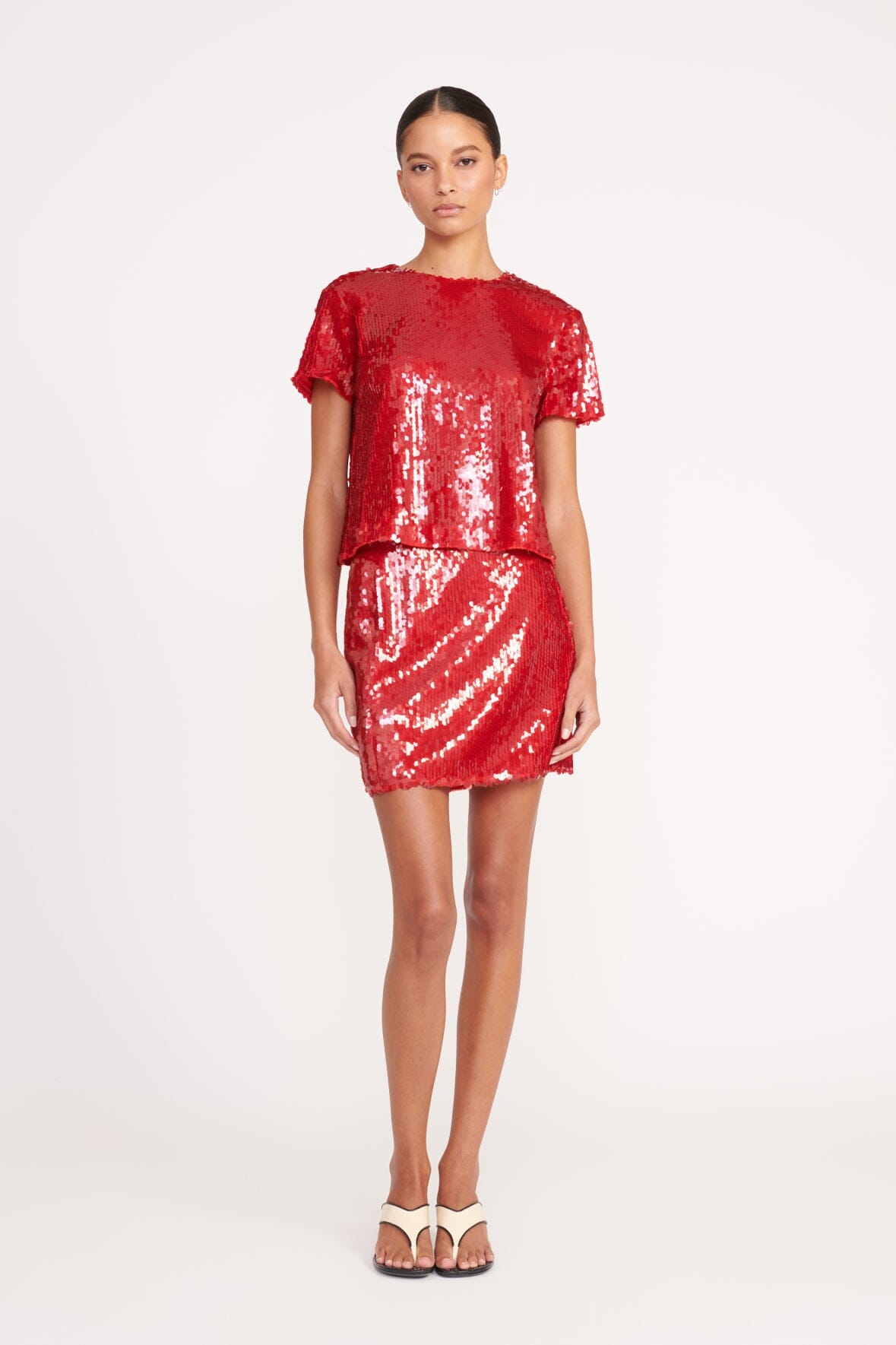 Our newest party skirt, The Vedette is a mini skirt with all over paillette embellishment. This style features a side zip and pairs perfectly with our Quincy Top.