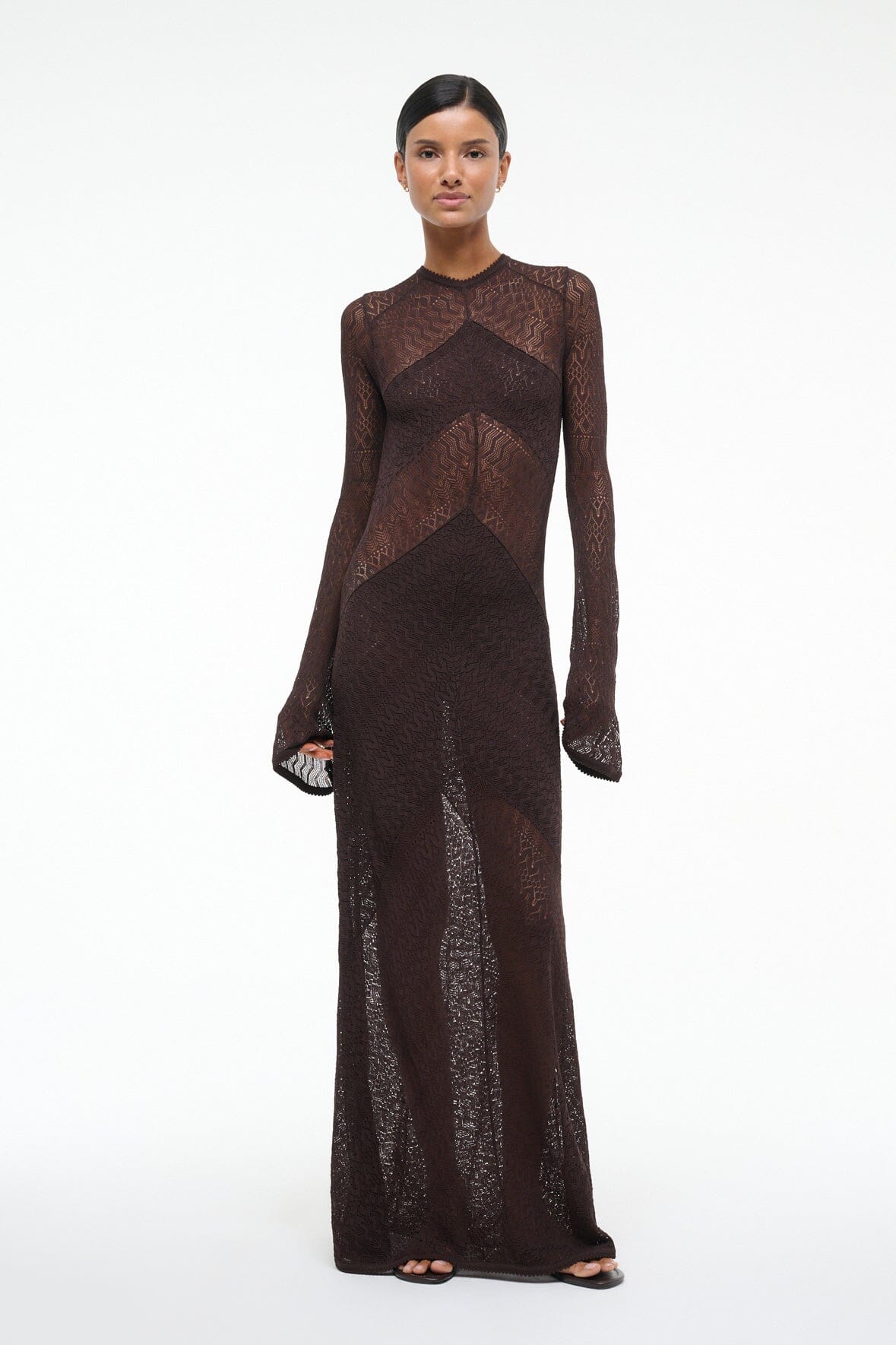 The Vera Dress is a sheer maxi dress in a knit pointelle. This style features long sleeves and an open back with a back neck tie.