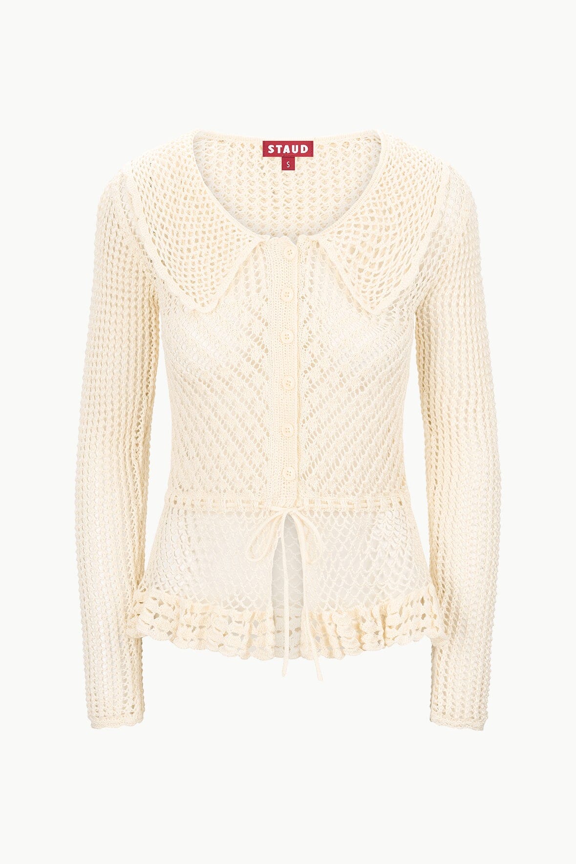 The Vienna Sweater is a mix crochet knit top, featuring a peter pan collar, a slight peplum flare, and center front buttons.
