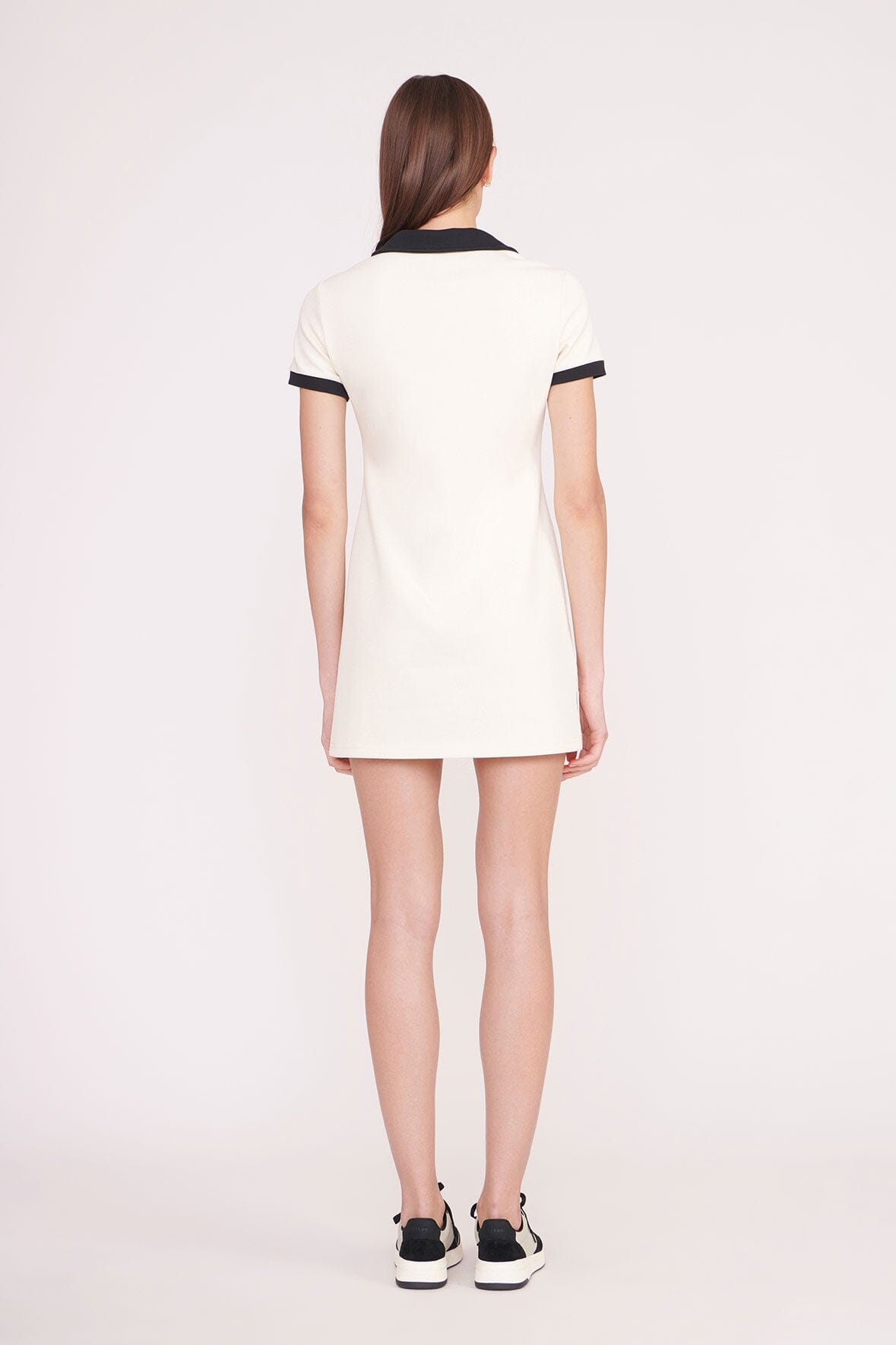 Cotton pique polo dress with short sleeves and a v-neck. The Volley Dress offers a relaxed silhouette and contrast collar and sleeve bindings.