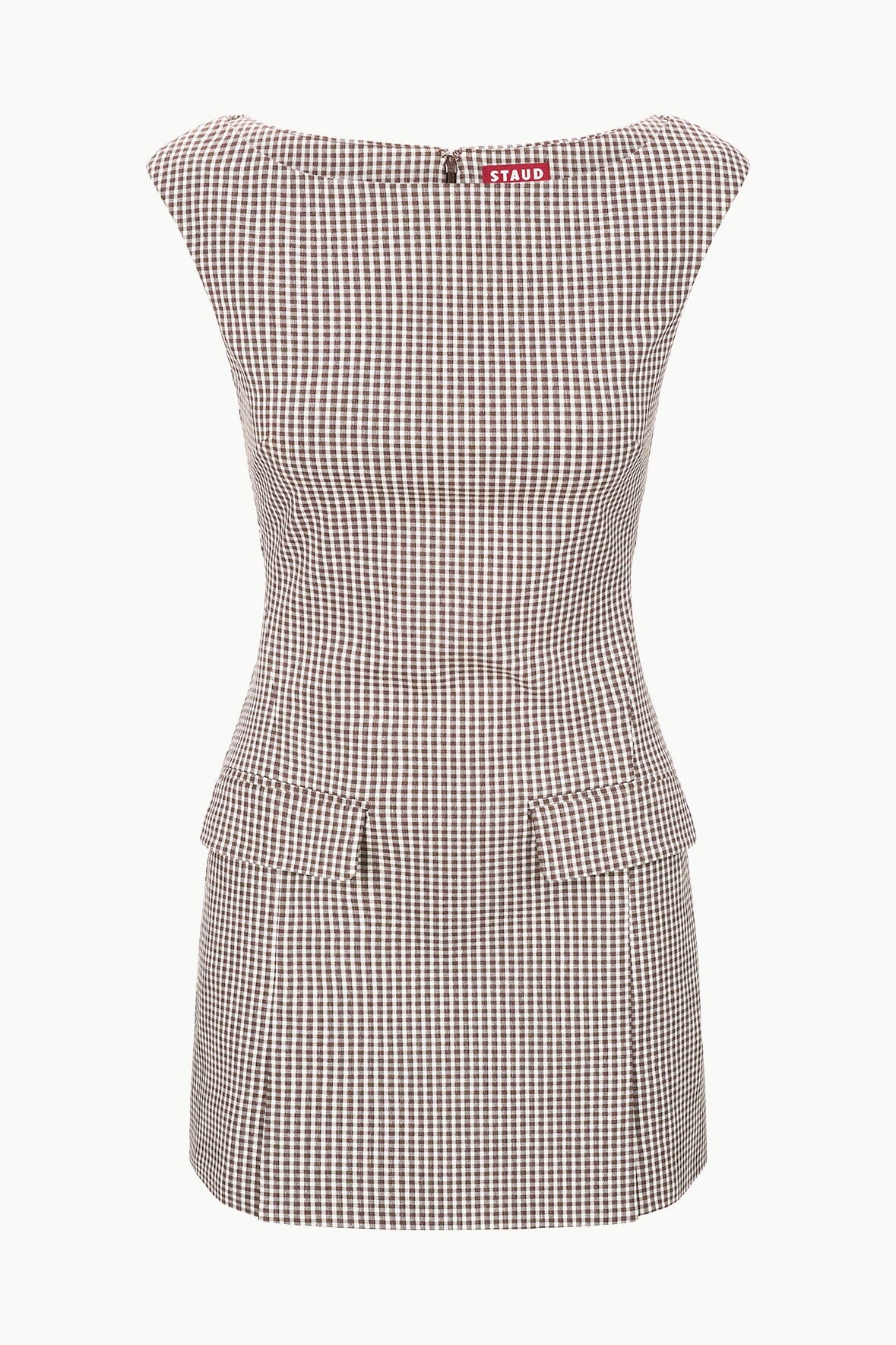 The Walker Dress is a boatneck mini dress with cap sleeves and flap pockets. It features subtle box pleats and a center back hidden zipper.