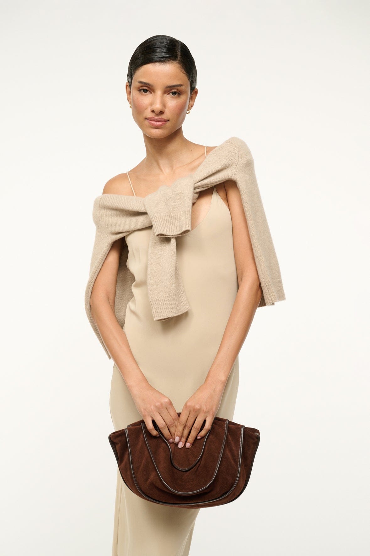 Introducing the Wells Bag - inspired by the corset seaming on our best-selling Wells Dress, the Wells Bag is a convertible shoulder bag that can be worn as a shoulder bag or clutch. This style features a removable strap with our signature leather wrapped handle detailing and a magnetic closure.