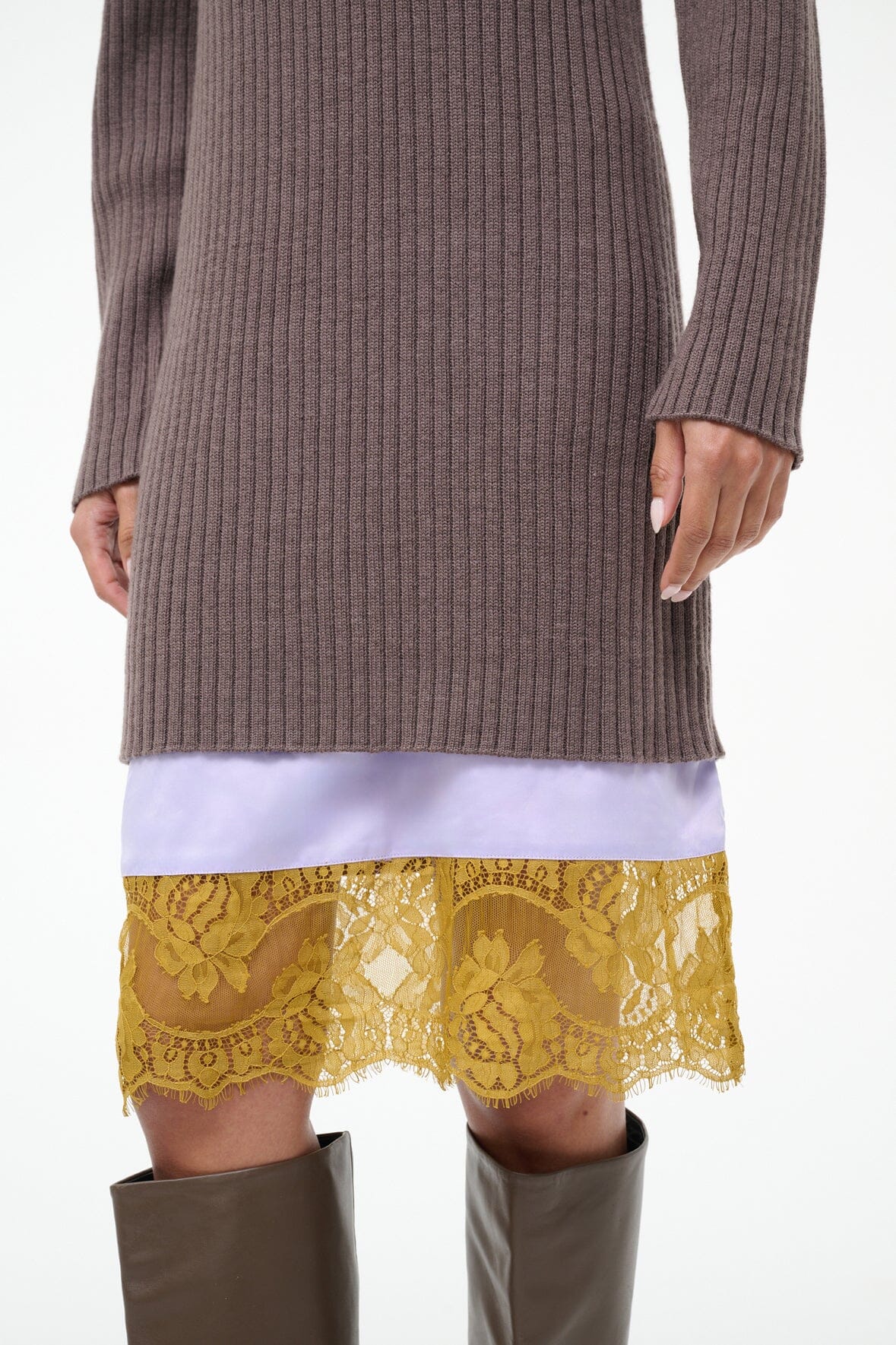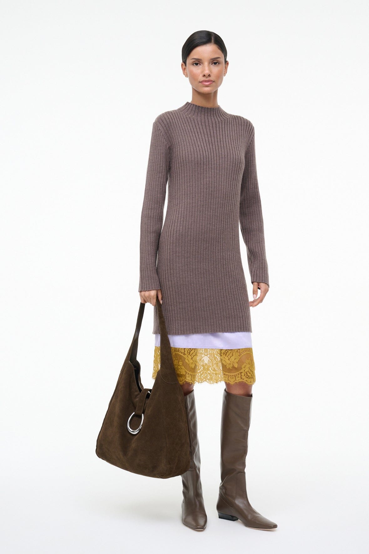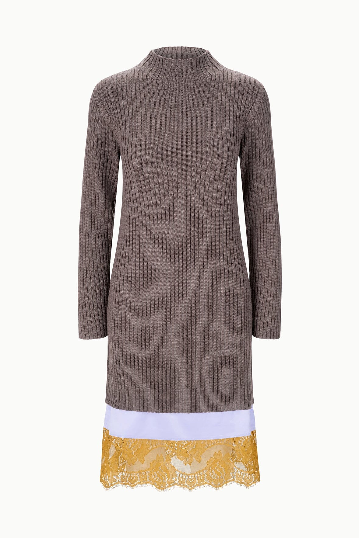 The Willow is a wool blend sweater dress that features a mock neck, long sleeves, and a layered contrast lace hem for pre-styled ease.