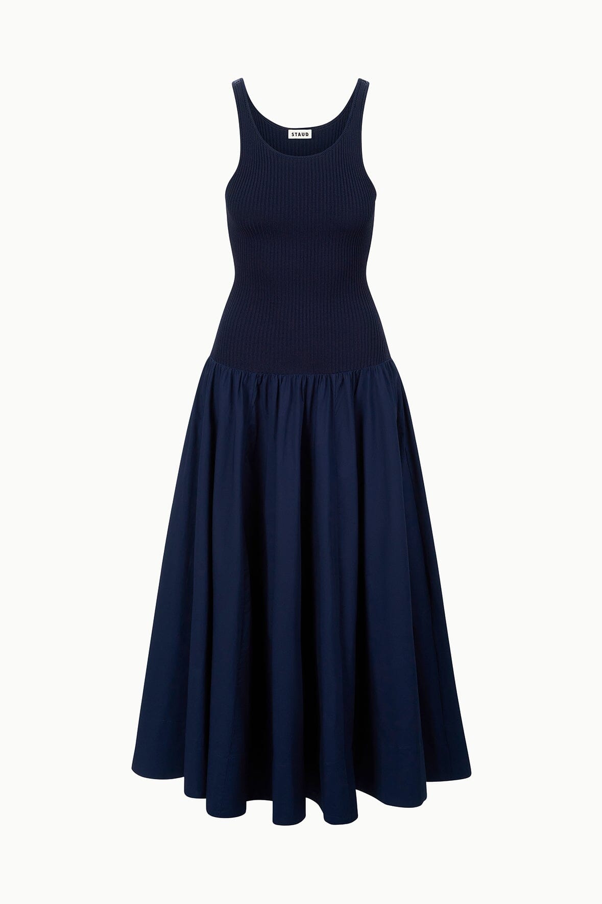 A racerback tank dress with a-line skirt, the Yamila features a compact knit top and stretch cotton poplin skirt for an easy day-to-night option.