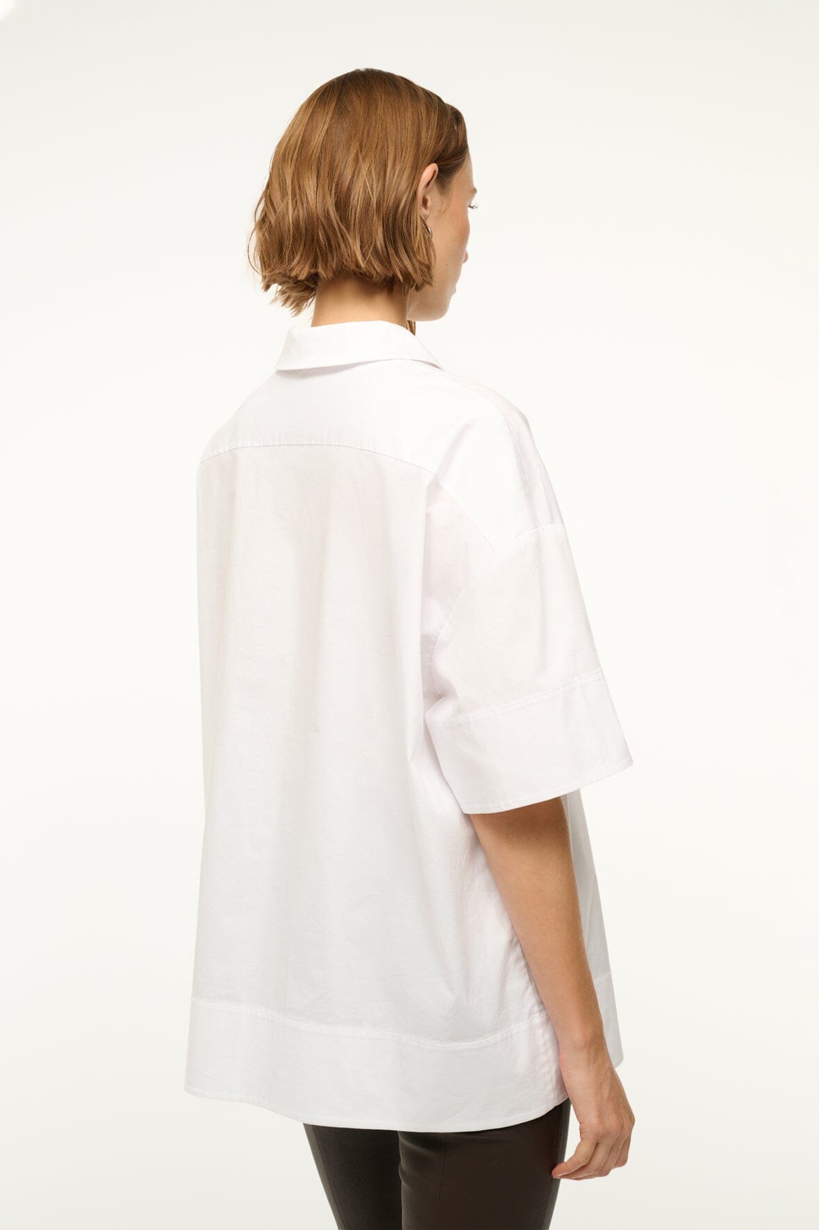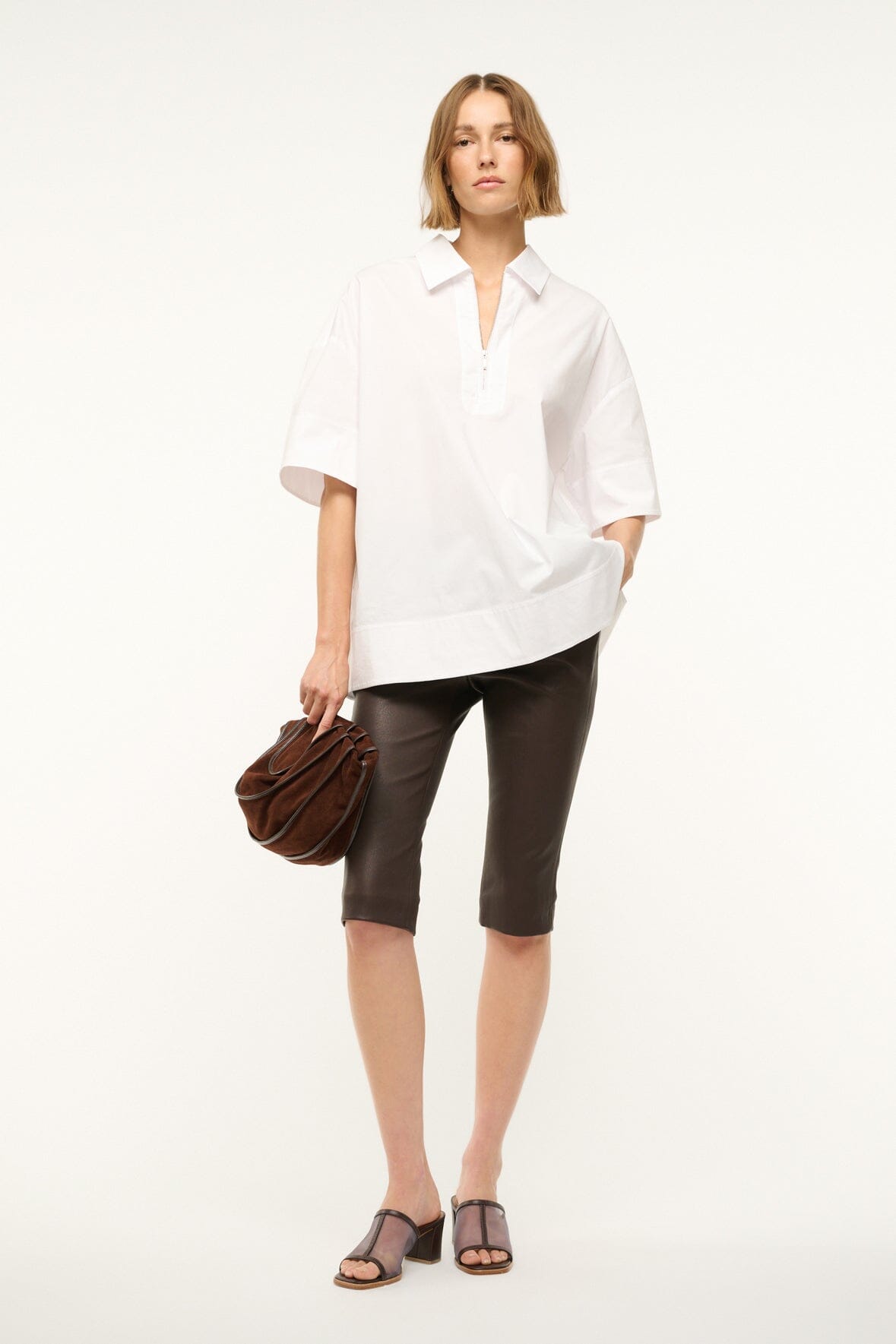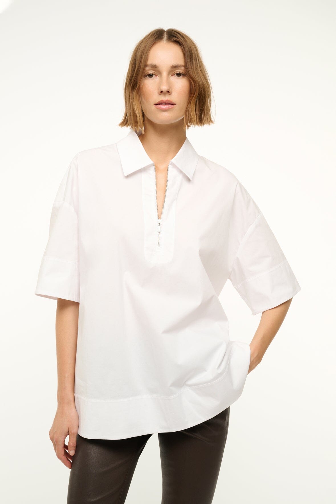 The Yvette is a boxy, oversized polo shirt made from cotton poplin. This style features a slightly longer tunic length, with short sleeves and a 1/4 zip detail at the front.